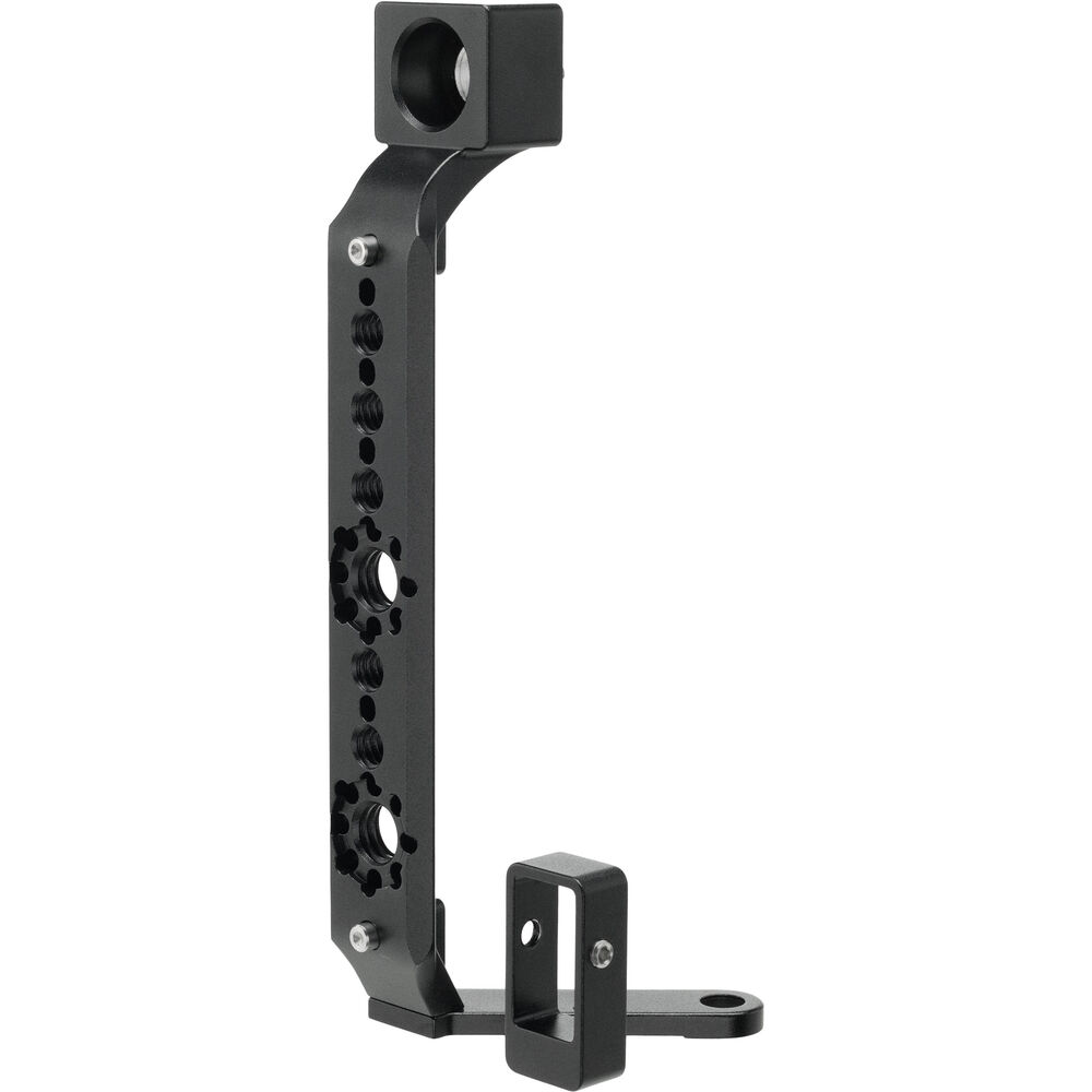 The Left-Side NATO Safety Bracket for Canon C70 from Wooden Camera offers protection, a detachable cable clamp, and multiple accessory mounts for your camera. This cage component mounts on the separately available Top Plate for C70. The bracket incorporates a NATO rail with safety pins on both ends, five 1/4"-20 threads, and two ARRI-style 3/8"-16 threads for attaching accessories such as handgrips.