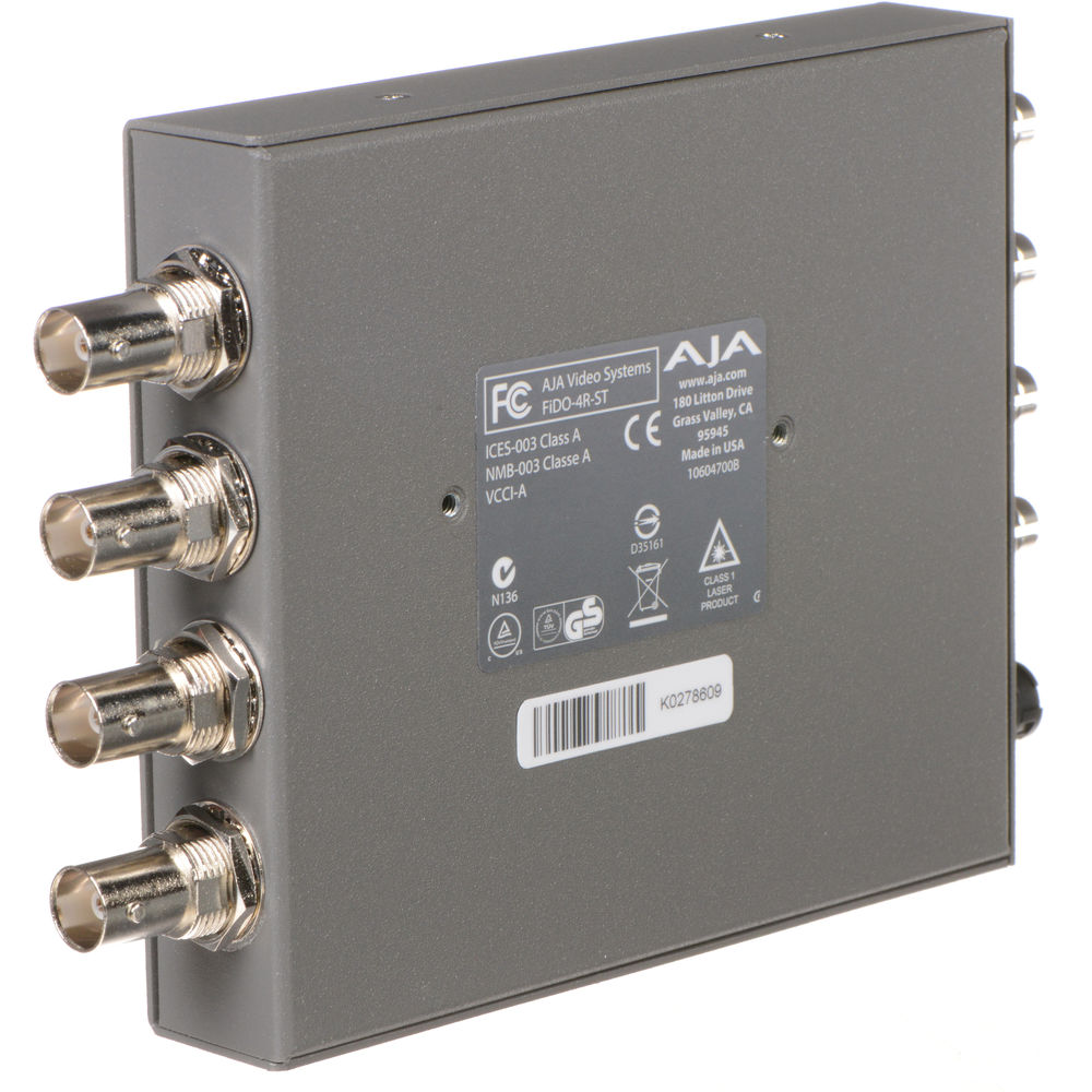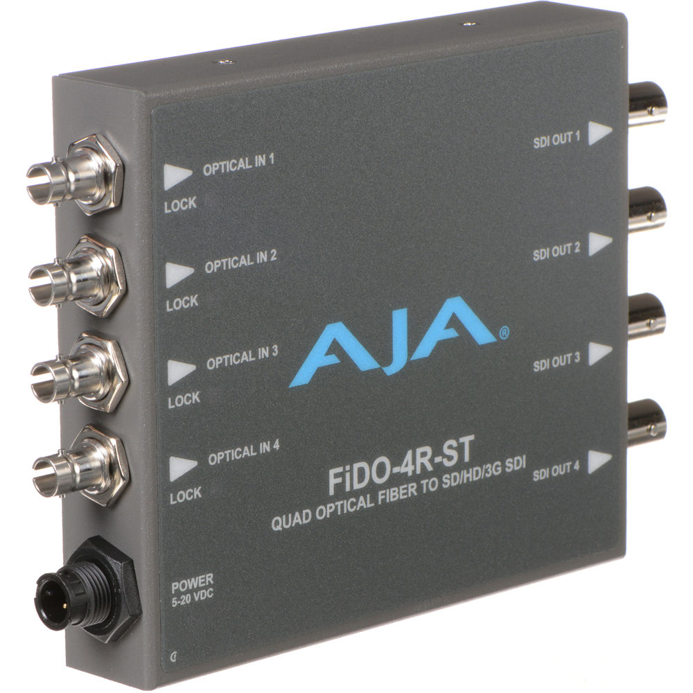 Convert four ST fiber signals each to a matched 3G-SDI output in resolutions up to Ultra HD 4K. Transmit the input signals from up to six miles away at the max resolution over single-mode fiber cables. AJA's FiDO-4R-ST features four ST optical fiber inputs and four 3G-SDI outputs, in a compact body suitable for indoor and outdoor use. Use it with compatible devices, or pair it with a corresponding FiDO Mini Converter.