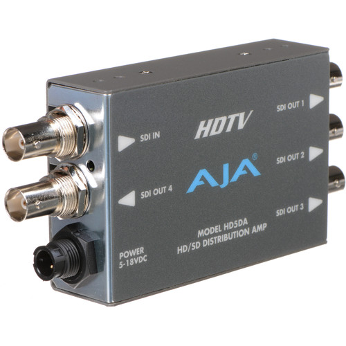 The AJA HD5DA 1x4 HD/SD-SDI Distribution Amplifier / Repeater with DWP features an auto-sensing input and four separately buffered outputs with automatic cable equalization (up to 410 ft in HD and 984 ft in SD by coax cable). Both input and outputs support embedded audio. A universal power supply comes included.