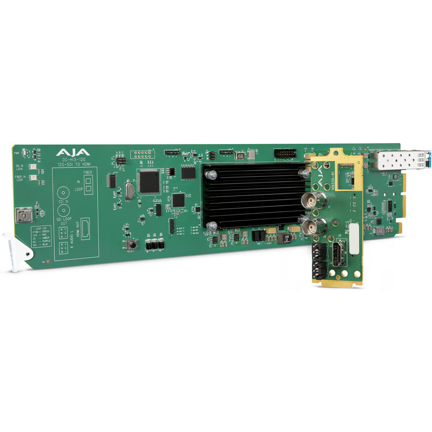 Monitor your HDR camera feed on a 4K monitor when using an openGear frame with this OG-Hi5-12G-R OpenGear 4K 12G-SDI to HDMI 2.0 Converter Card with Fiber LC Connector from AJA. This card installs into an openGear frame and provides video input via the LC fiber receiver or 12G-SDI from a 12G-SDI source and outputs via HDMI for viewing on a 4K monitor.