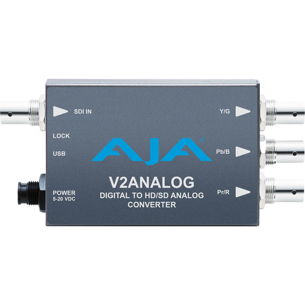 The V2Analog HD/SD-SDI to Analog Mini-Converter from AJA provides SDI digital to component/composite analog conversion at either HD or SD resolutions. It is ideal for integrating analog equipment such as monitors and tape decks into digital workflows. It utilizes a full 10-bit data path to ensure a high-quality conversion. Its low power consumption and compact size, makes it suitable for use on set or in AV installations integrating different signal types.