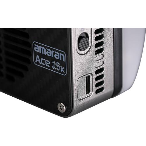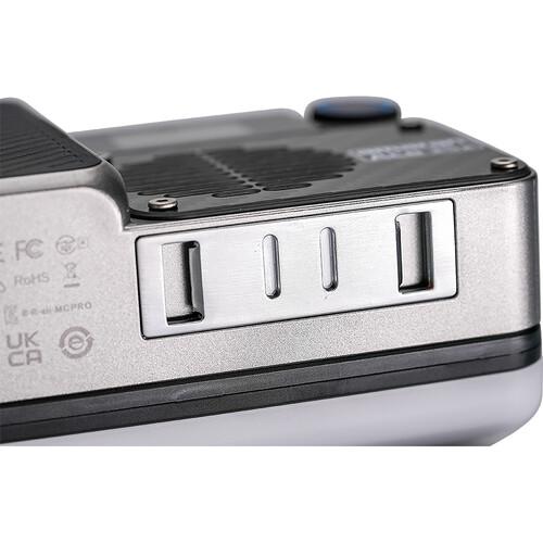 The light's internal, rechargeable battery recoups 90% of its charge in just 40 minutes with the included USB-C charging cable, achieving a full recharge in approximately 90 minutes. The included lock-to-cold shoe adapter makes the light easily mountable on any camera with a shoe mount, and a 1/4"-20 thread on the bottom of the fixture allows mounting on most light stands. The Ace 25x's magnetic front accessory mount accepts modifiers like the included dome diffuser, while a back magnetic silicone pad allows the light to be mounted on any magnetic surface.