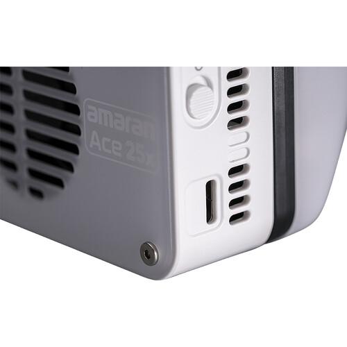 The light's internal, rechargeable battery recoups 90% of its charge in just 40 minutes with the included USB-C charging cable, achieving a full recharge in approximately 90 minutes. The included lock-to-cold shoe adapter makes the light easily mountable on any camera with a shoe mount, and a 1/4"-20 thread on the bottom of the fixture allows mounting on most light stands. The Ace 25x's magnetic front accessory mount accepts modifiers like the included dome diffuser, while a back magnetic silicone pad allows the light to be mounted on any magnetic surface.