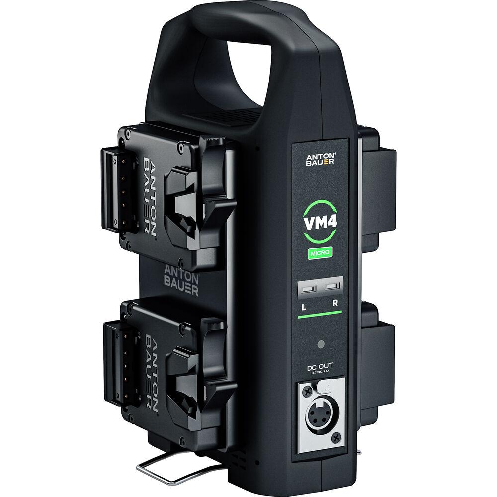 Simultaneously charge four high-capacity Micro batteries quickly while powering another device using this V-mount VM4 Quad Micro Battery Charger from Anton/Bauer. This four-bay, simultaneous V-mount battery charger is aimed at location shoots, rental facilities, ENG/EFP/OB vehicles, broadcast equipment depots, or productions that require many batteries to be on charge and ready to go.