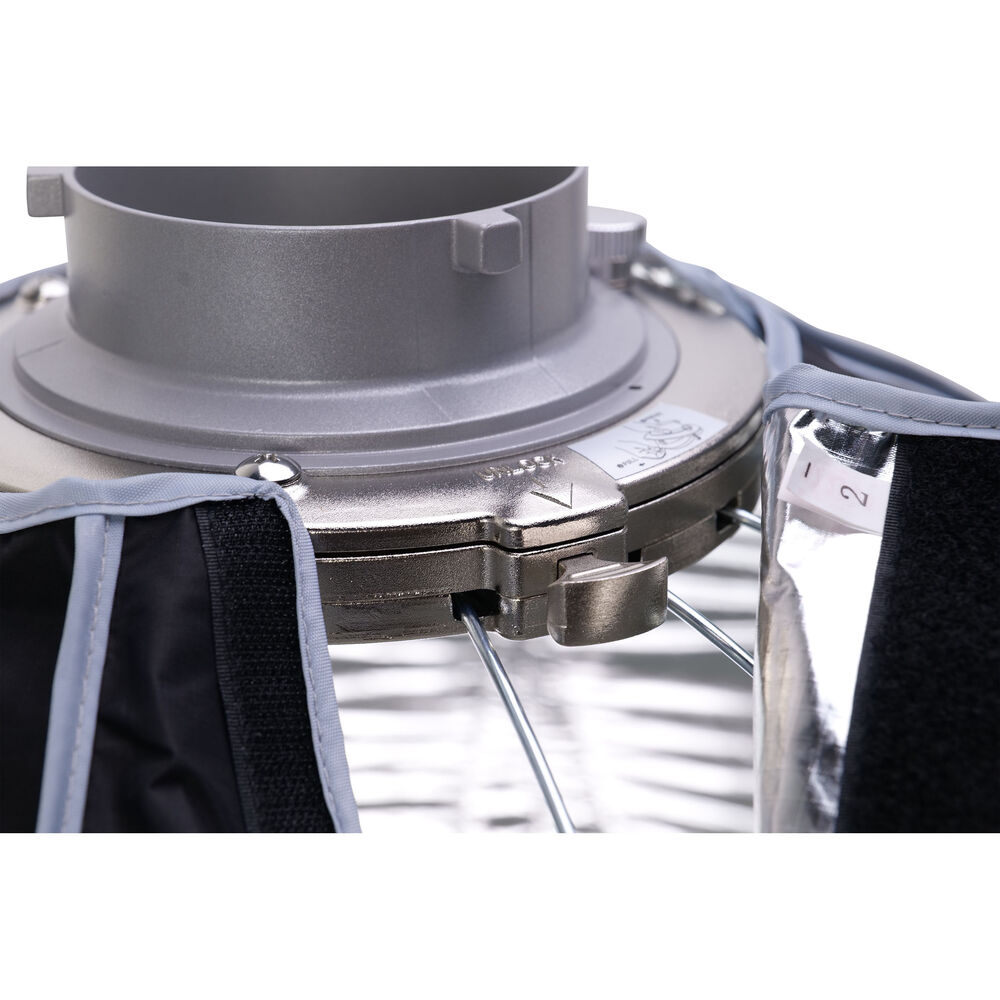 Armed with an upgraded dual-sided and foldable quick release mechanism, the 22.8" Light Dome Mini III from Aputure accelerates the set-up time for its 16-sided, point source-softening circular softbox, bringing professional, portrait-ready light to any shoot in mere seconds. Optimized for lightweight portability, the parabolic, hexadecanol structure of the Light Dome Mini III is fortified by 16 durable steel support rods, which now snap into place with the downward press of its widely-compatible Bowens Mount bracket, saving valuable time on set. Its shape also promotes uniform light output distribution for soft, even light on any subject. The modifier features a silver interior to maximize the light source's output and comes with an inner diffuser, 1.5-stop and 2.5-stop front diffusers, and a 40° fabric grid for further light-shaping capabilities.