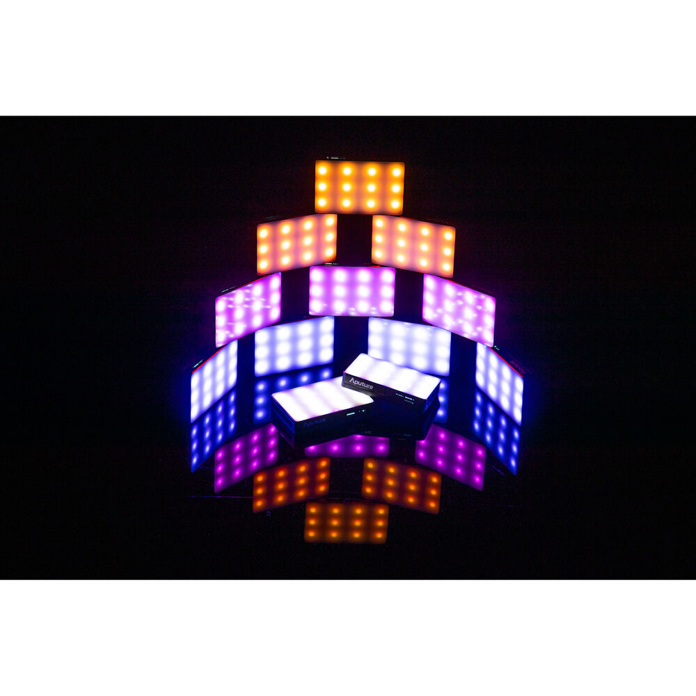 The Aputure MC 12-Light Production Kit includes 12 Aputure MC light fixtures, a wireless charging case, and accessories. The MC light fixtures are part of the Aputure M-series of lights and feature RGB LEDs, as well as both tungsten- and daylight-balanced LEDs, creating a full hue-controllable LED light that emits up to 95% of the BT.2020 color gamut. This lightweight light fixture easily fits in the palm of your hand and can be mounted using the built-in 1/4"-20 threaded mounting hole or attached to metal items via its built-in magnets. The light integrates an OLED display screen and a control wheel. Compatibility with the Aputure Sidus Link app enables you to remotely control your light from your mobile device. The light fixture supports the Sidus Mesh technology that enables you to control multiple fixtures.
