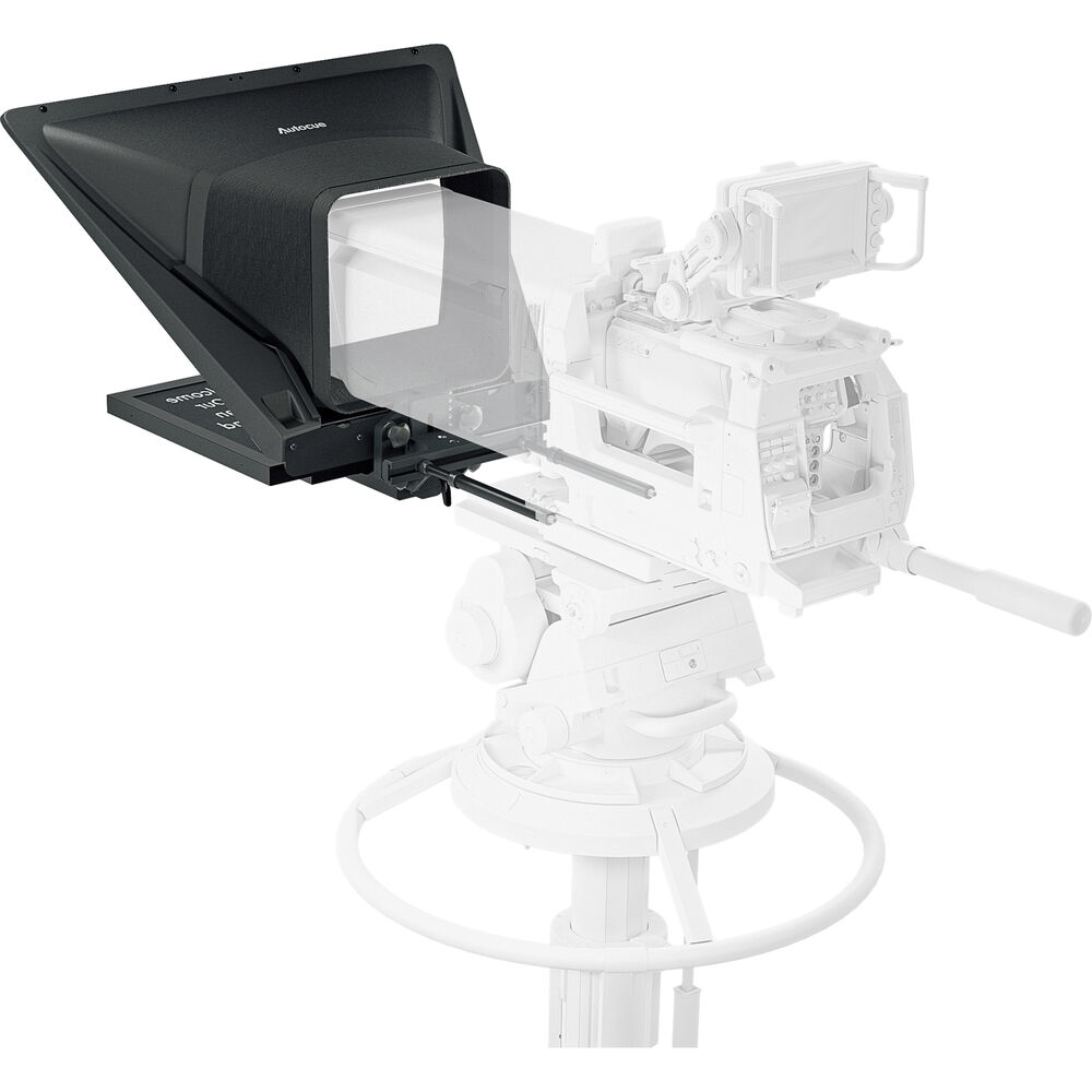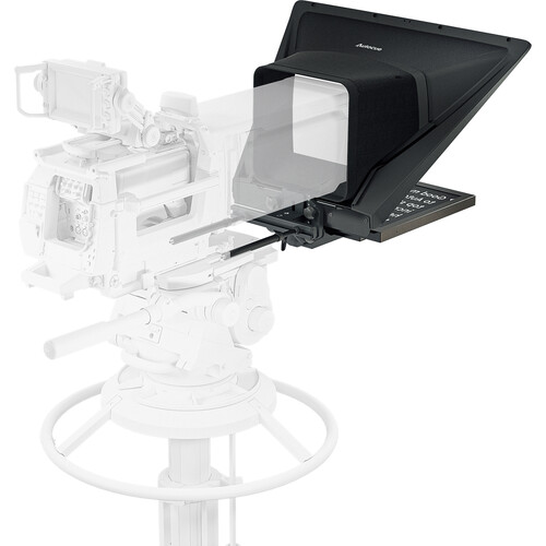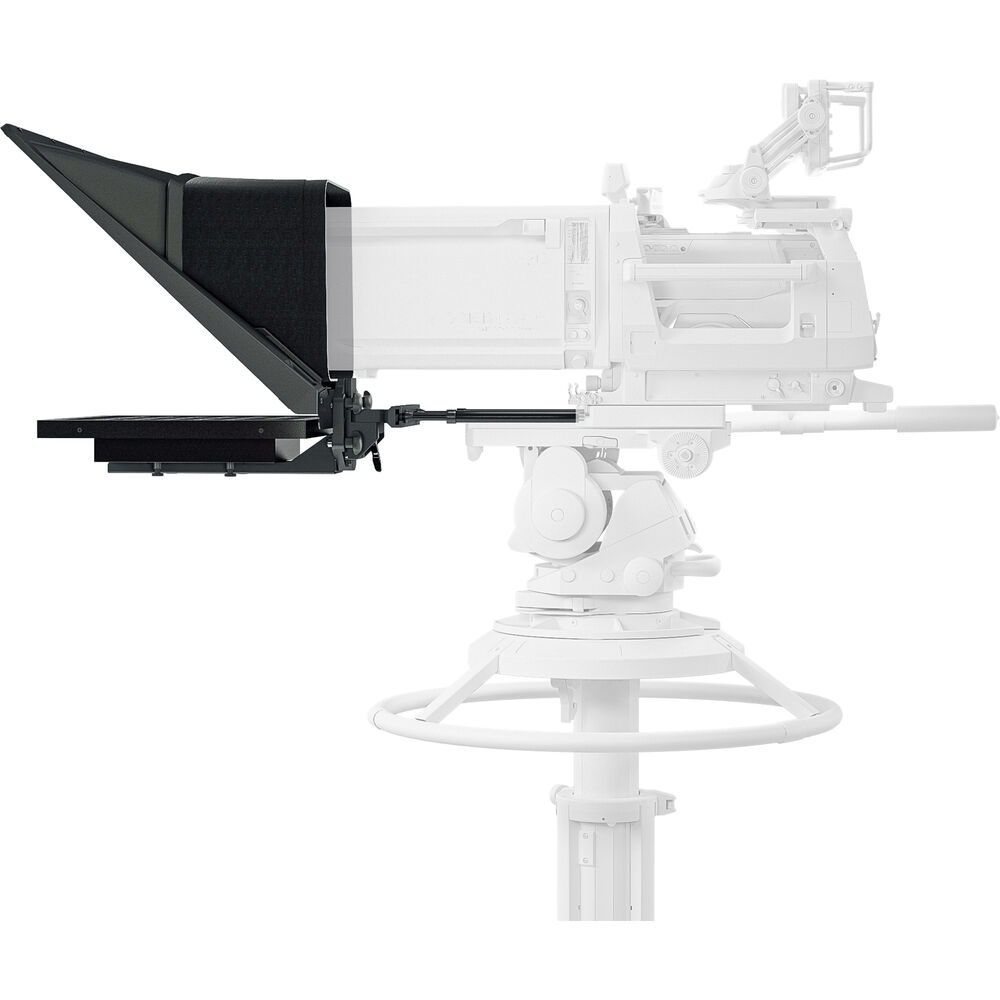 The studio lens hood assembly has a bigger opening and black cloth interior for compatibility with large box lenses while preventing light leak into the 70/30 Beamsplitter glass reflection. Telescopic rods with a 9.3" total adjustment allow you to mount the system in front of a pan/tilt camera head and move the prompter independently to avoid heavy lifting. The system has a total vertical adjustment of 3.5" for further fine-tuning. The monitor supports vertical and horizontal image flip.