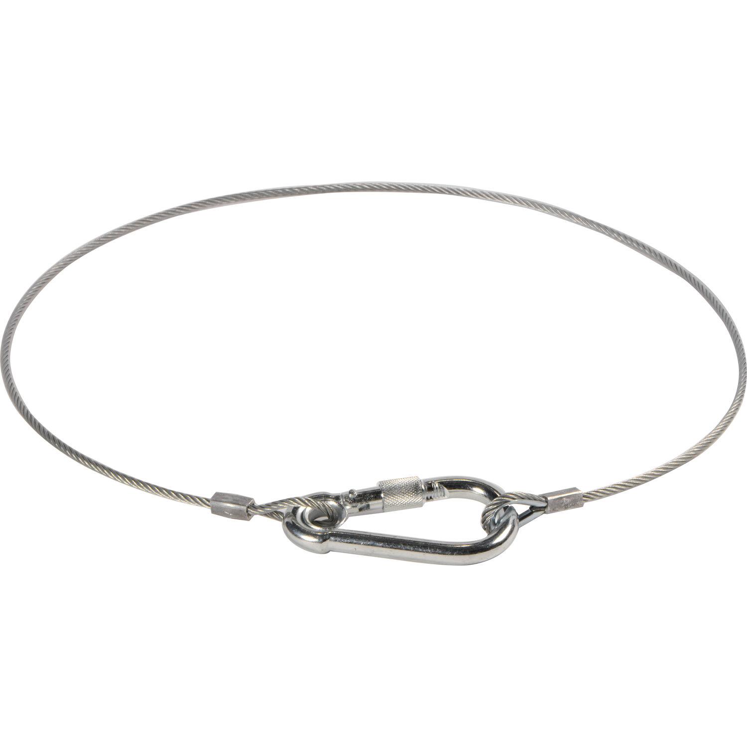 The Avenger C155 Safety Cable is a 3.3' long steel cable which acts as a fail-safe device for hanging overhead light fixtures with clamps. It has a load capacity of 66.14 lb. One end has a closed loop which fits through the larger, screw-lock loop.
