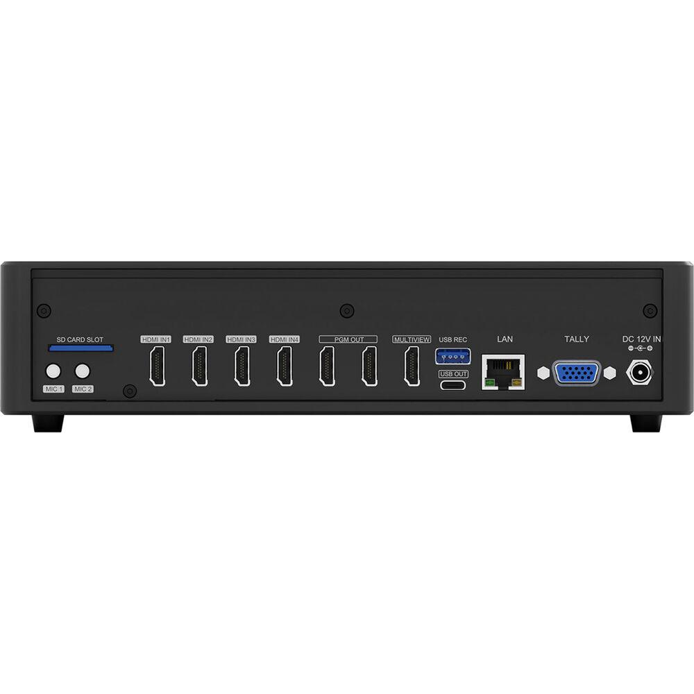 This compact switcher supports up to 1080p60 video input and output with embedded audio, and it offers audio mixing using the two analog stereo 3.5mm mic/line inputs and embedded audio. Switcher control options include push buttons, a T-bar, and IP control via the LAN port.