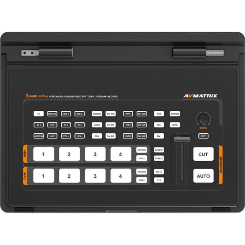 Switch up to four HDMI video inputs while monitoring the program feed with the portable Shark H4 PLUS 4-Channel HDMI Video Switcher with 10.1" IPS Display from AVMATRIX. This model features a folding design with a 10.1" IPS LCD screen on the lid. Use the USB-C output together with your computer for capture and live streaming using your computer, and record directly from the unit using the USB-A output or SD card slot.