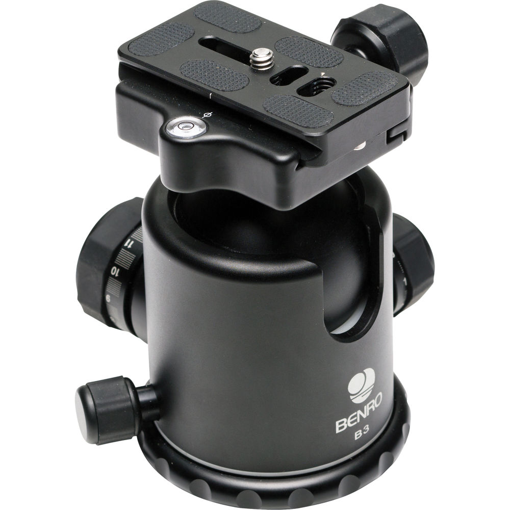 A member in good standing of Benro's new generation of B Series professional ball heads, the B3 Triple Action Ball Head uses magnesium-alloy components for better performance and lighter weight. The B3 has a triple action design featuring panning and locking knobs, and, a long, precise friction adjustment. Also, the head has a graduated panning scale, and an Arca-type QR adapter with a PU-60 QR plate. It can handle weights up to 39.7 lb and only tips the scales at 1.5 lb itself.
