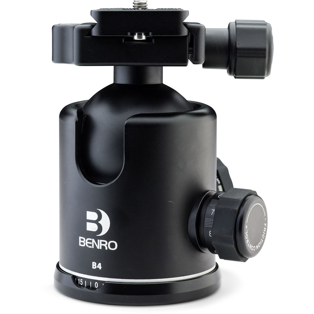 Support up to 44.1 lb with the B4 Triple Action Ball Head from Benro. This standard ball head features separate locks for the ball movement and the 360° panning, as well as a friction control to adjust the amount of drag. The head is designed to fit on 4-Series Benro tripods, but will work on most tripods with a 3/8"-16 threaded mount. The included quick release plate is compatible with most Arca-type clamps. A 90° notch in the head allows you to easily adjust the camera to portrait orientation.