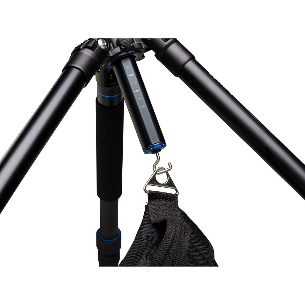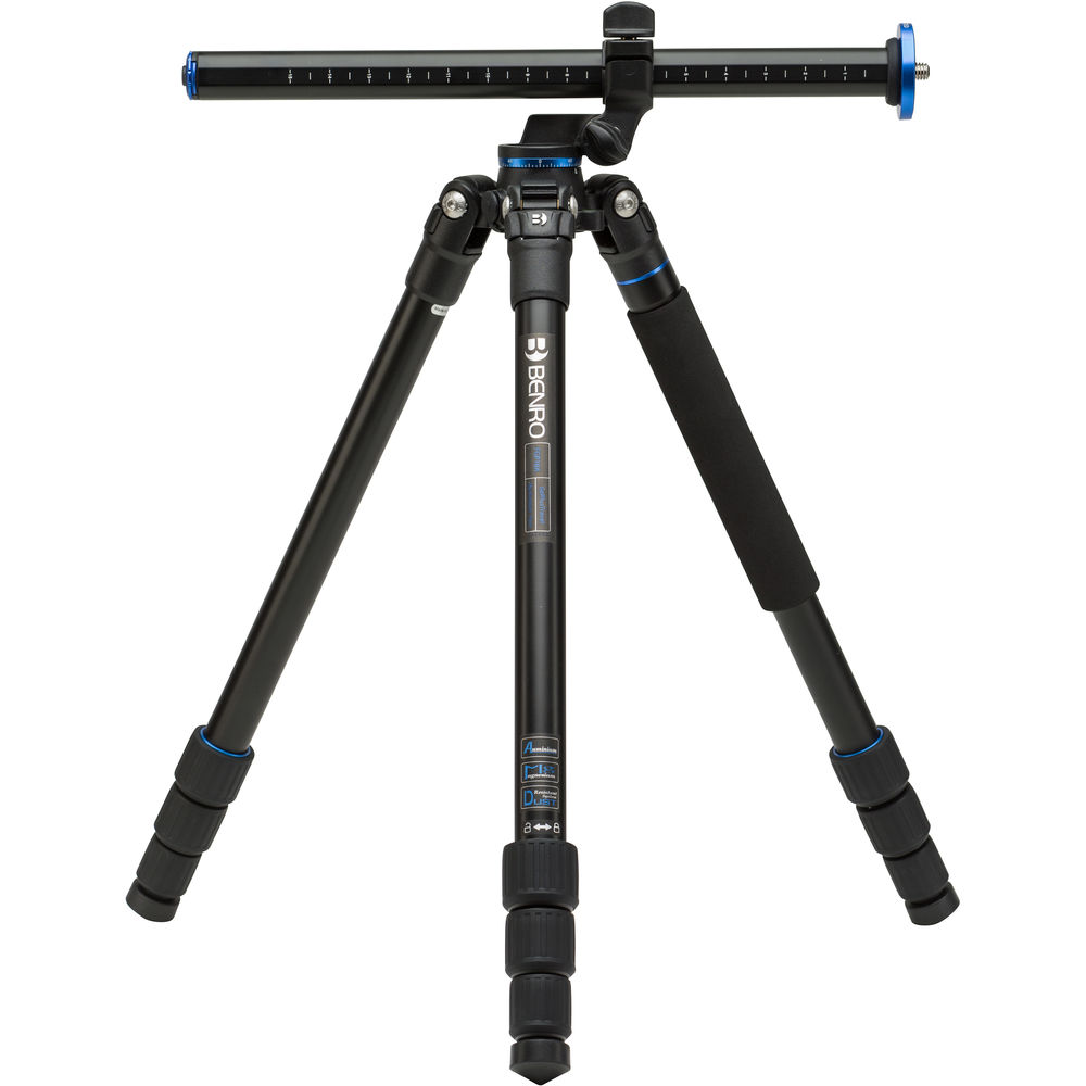 Each of the tripod's legs features a 4-section design allowing for the optional deployment of different leg sections to achieve varying heights. The legs also utilize Benro's sealed twist-locks which help to resist dust and moisture. One of the legs, marked with a blue ring, can also be joined with the center column to form a monopod - a useful feature for shooting in environments where tripods may not be permitted. The center column also features a unique lateral arm function which allows the column to tilt horizontally and lock in a wide range of different angles and positions.