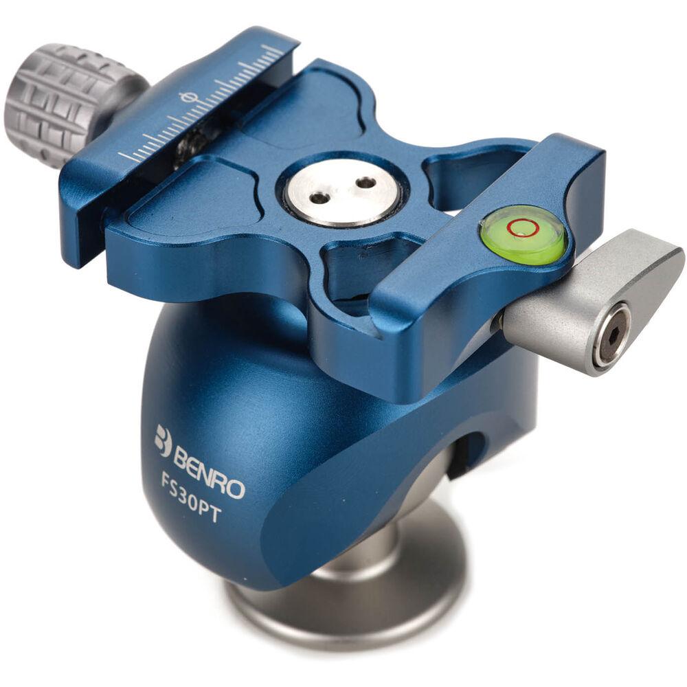 The FS30PT Inverted Ball Head from Benro features an inverted design to handle cameras weighing up to 10 lb with ease. It has a top plate that provides smooth 360° panoramic rotation and has an integrated Arca-type quick release set. The quick release clamp has pull-and-twist locking mechanism for secure attachment and quickly changing plates. A built-in bubble level makes it simple to level every shot.