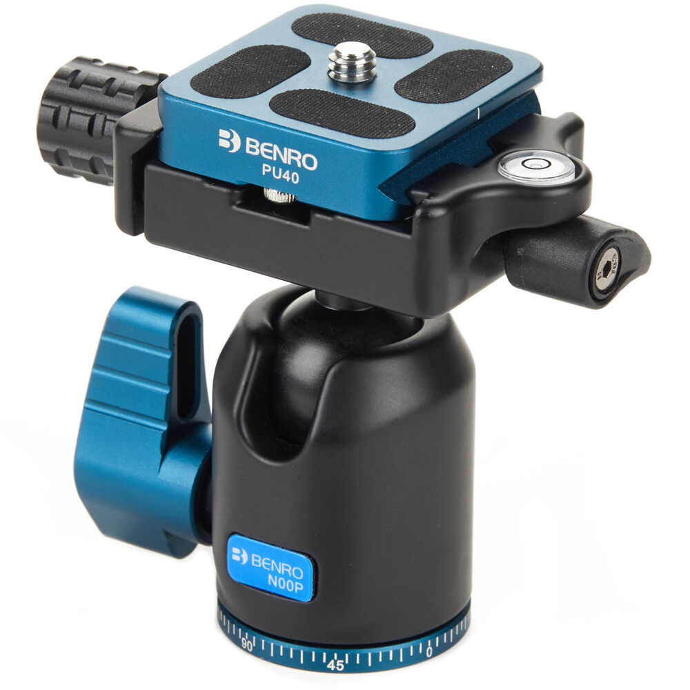 The N00P Ball Head from Benro is a double action ball head with single locking knob for easy operation. The knob provides ball lock and pan lock for precise positioning. This compact head has a load capacity of 8.8 pounds, yet weighs only 7.8 ounces. The head also features a 90-degree notch for vertical shooting. The had as an Arca-type quick release clamp a PU40 camera plate with 3-way screw for quick attachment.