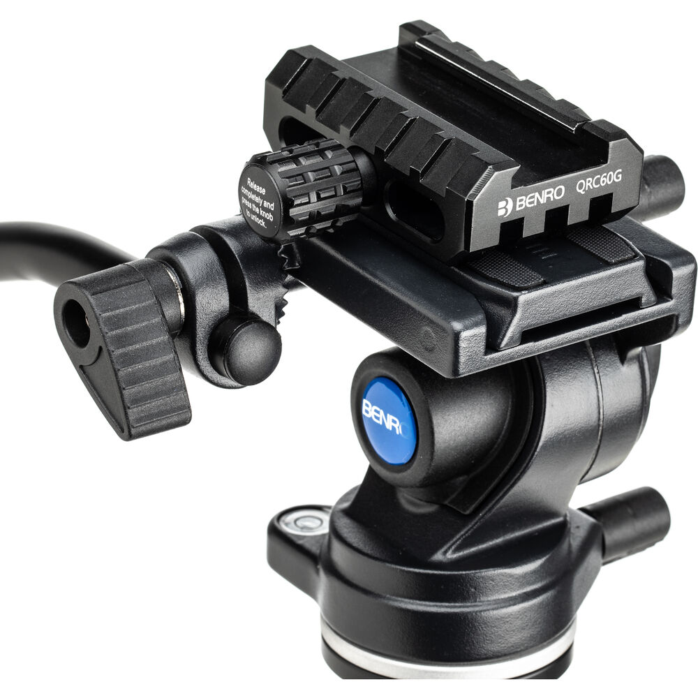 The video head offers smooth damping for both pan and tilt movements. It features an adjustable pan bar and an Arca-Swiss style camera plate with a D-ring 1/4"-20 mounting screw.
