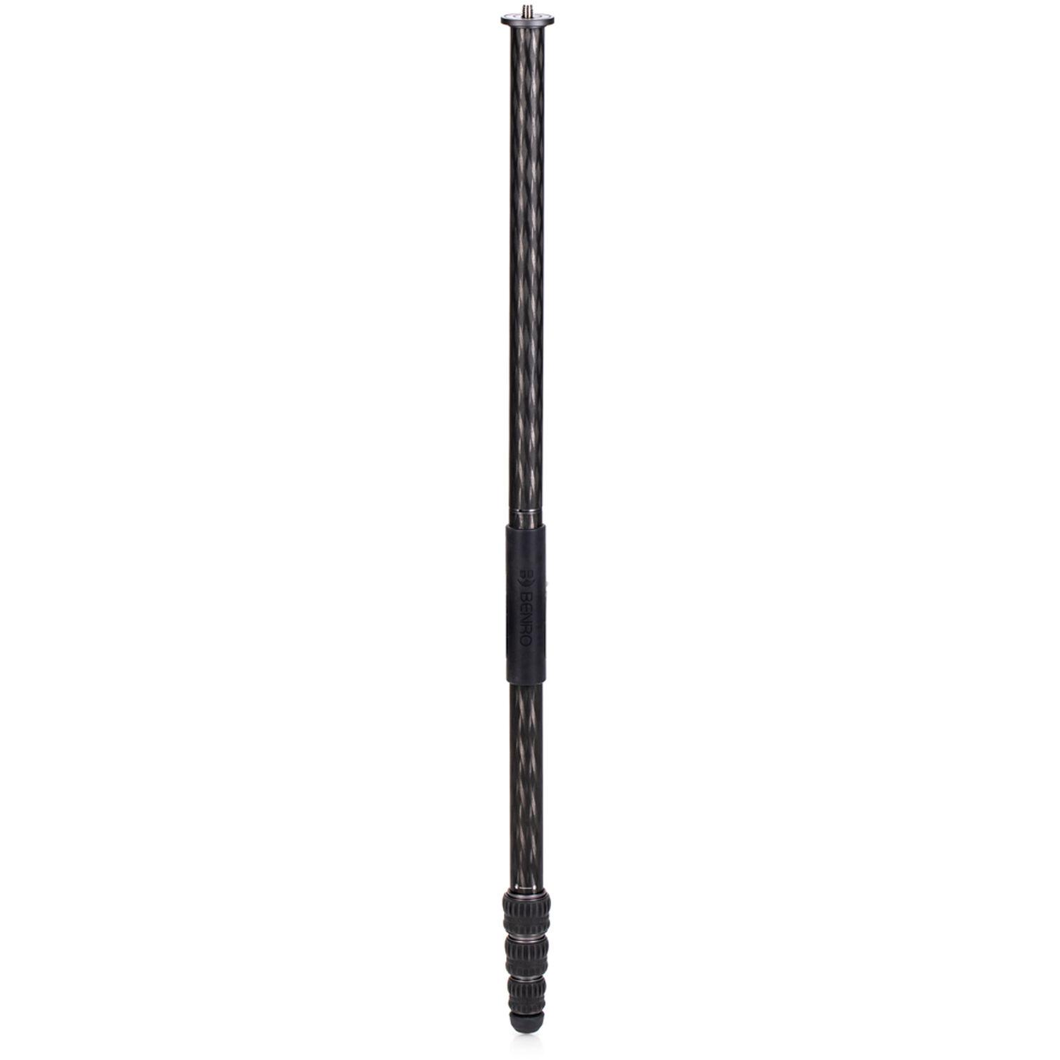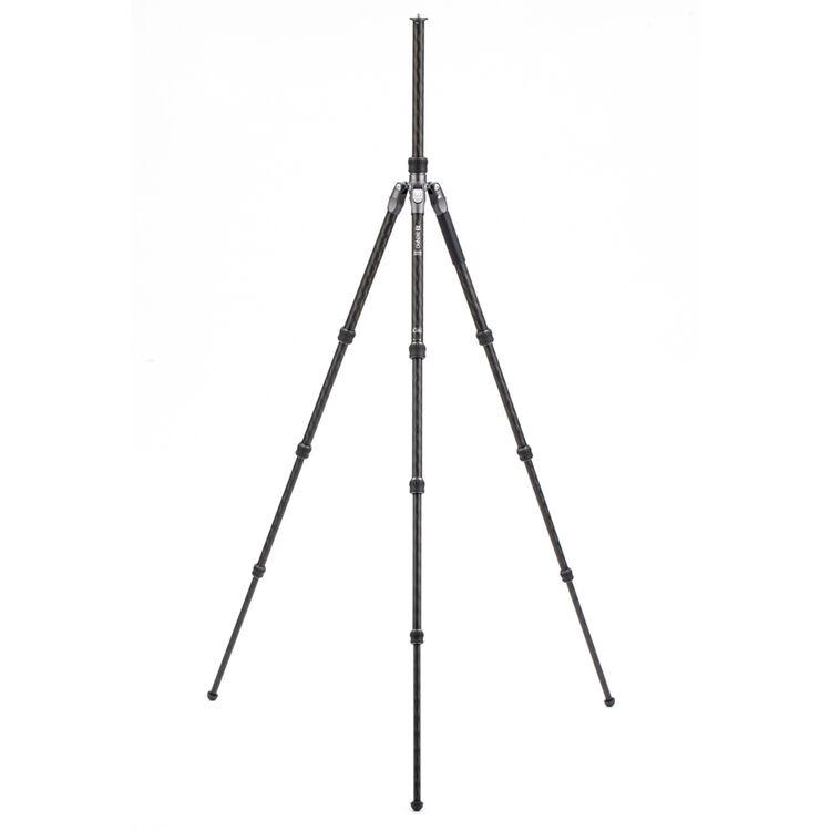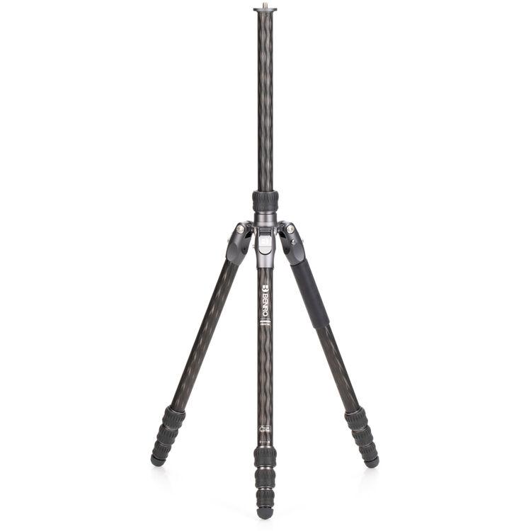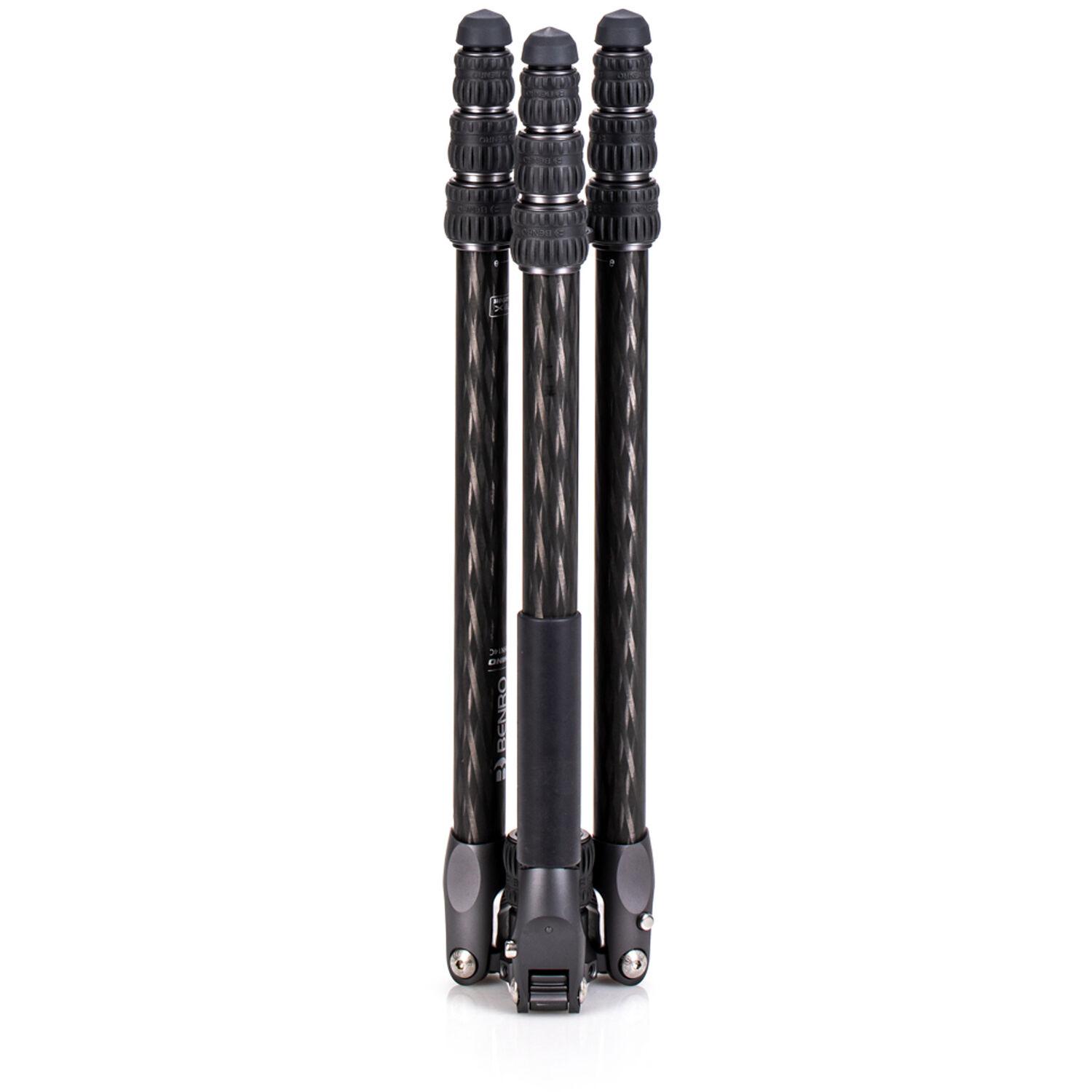 The Rhino One Series Carbon Fiber Tripod from Benro has a maximum height of 65.2", a load capacity of 35.2 pounds, and is compatible with any type of ball head, gimbal, or pan/tilt head. The reverse-folding design allows the tripod to fold down to a compact 24.4" for easy storage or transport. Each leg features an automatic leg angle adjustment button that makes it easy to adjust leg angles for low-level positioning or leveling on uneven terrain. The center column and one leg can be removed and combined into a 67.3" tall monopod for shooting conditions where a tripod may be too bulky or slow, as when shooting sports or wildlife. Each leg has a rubber foot and an interchangeable steel spike for traction on all kinds of surfaces.