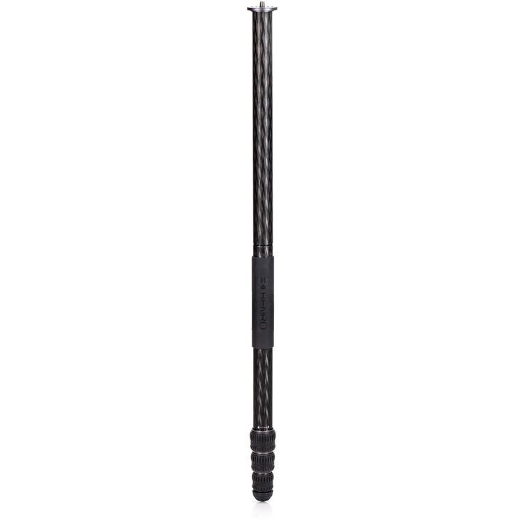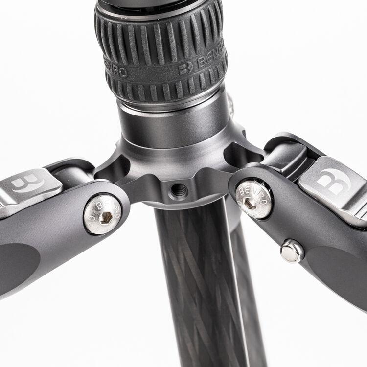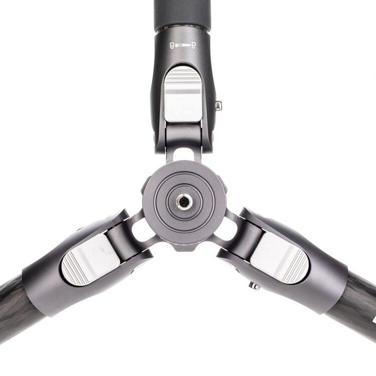 The Rhino Three Series Carbon Fiber Tripod from Benro has a maximum height of 68.8", a load capacity of 44 pounds, and is compatible with any type of ball head, gimbal, or pan/tilt head. The reverse-folding design allows the tripod to fold down to a compact 25.9" for easy storage or transport. Each leg features an automatic leg angle adjustment button that makes it easy to adjust leg angles for low-level positioning or leveling on uneven terrain. The center column and one leg can be removed and combined into a 71.4" tall monopod for shooting conditions where a tripod may be too bulky or slow, as when shooting sports or wildlife. Each leg has a rubber foot and an interchangeable steel spike for traction on all kinds of surfaces.