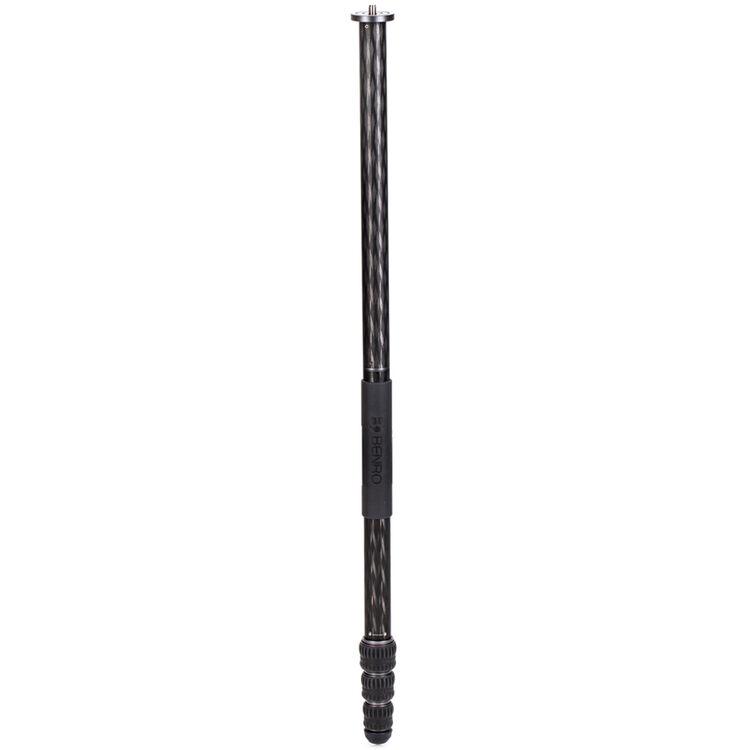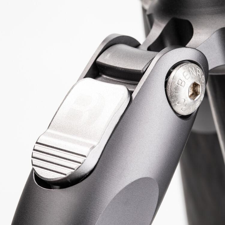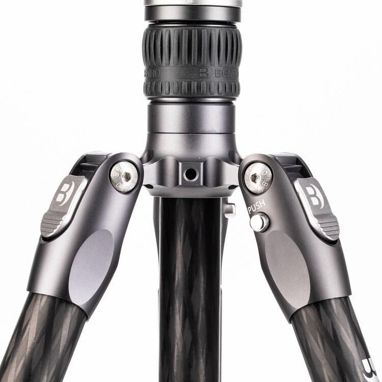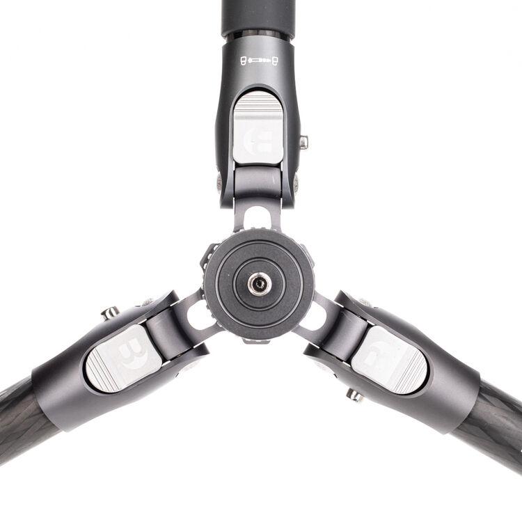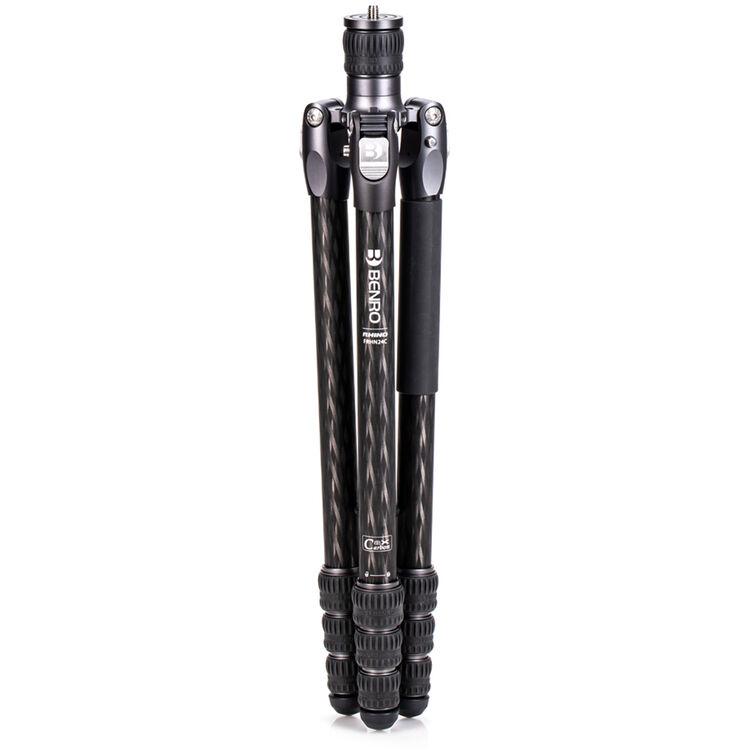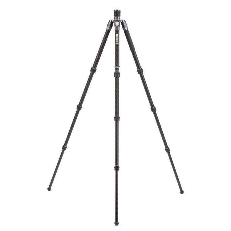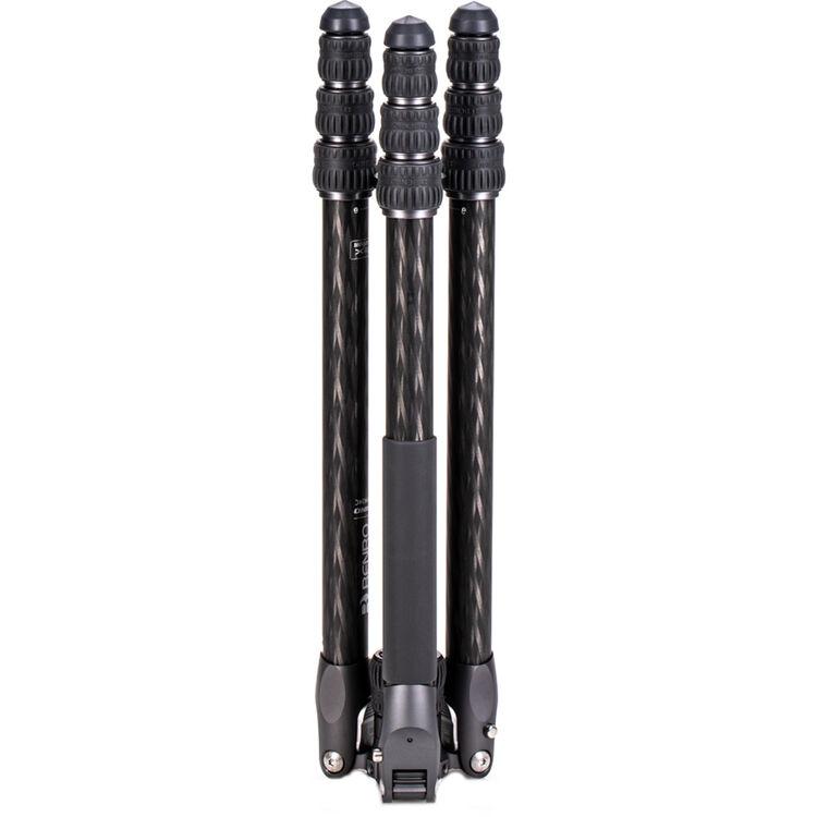 The Rhino Two Series Carbon Fiber Tripod from Benro has a maximum height of 66.3", a load capacity of 36.6 pounds, and is compatible with any type of ball head, gimbal, or pan/tilt head. The reverse-folding design allows the tripod to fold down to a compact 25.2" for easy storage or transport. Each leg features an automatic leg angle adjustment button that makes it easy to adjust leg angles for low-level positioning or leveling on uneven terrain. The center column and one leg can be removed and combined into a 69" tall monopod for shooting conditions where a tripod may be too bulky or slow, as when shooting sports or wildlife. Each leg has a rubber foot and an interchangeable steel spike for traction on all kinds of surfaces.