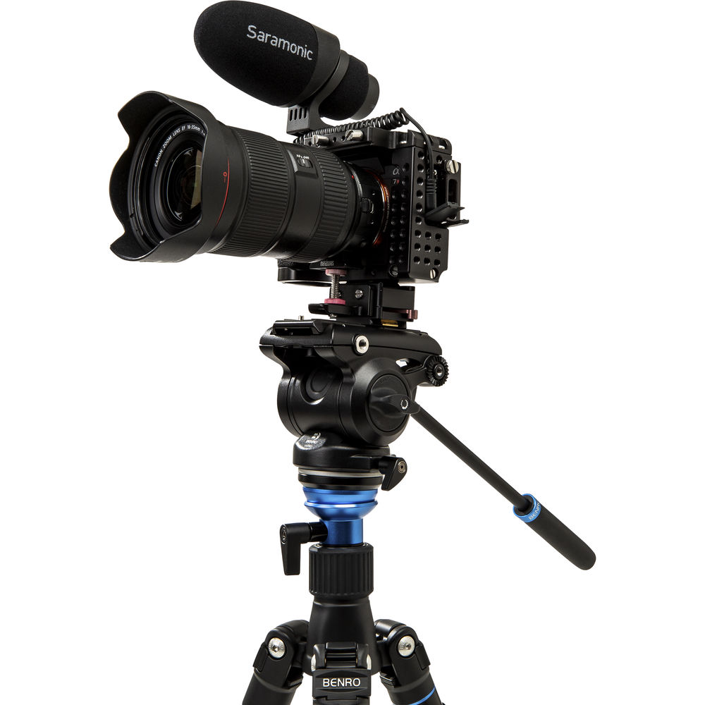The Benro S4Pro is a compact fluid video head ideal for mirrorless and DSLR camera setups weighing up to 8.8 lb. Featuring a 60mm flat base with a 3/8"-16 threaded hole, it can be used with matching 60mm flat base tripods and tripods with flat base adapters. At the same time, thanks to the flat base, it can be mounted on sliders, jibs, monopods, and other support gear. It can efficiently be moved between such gear.
