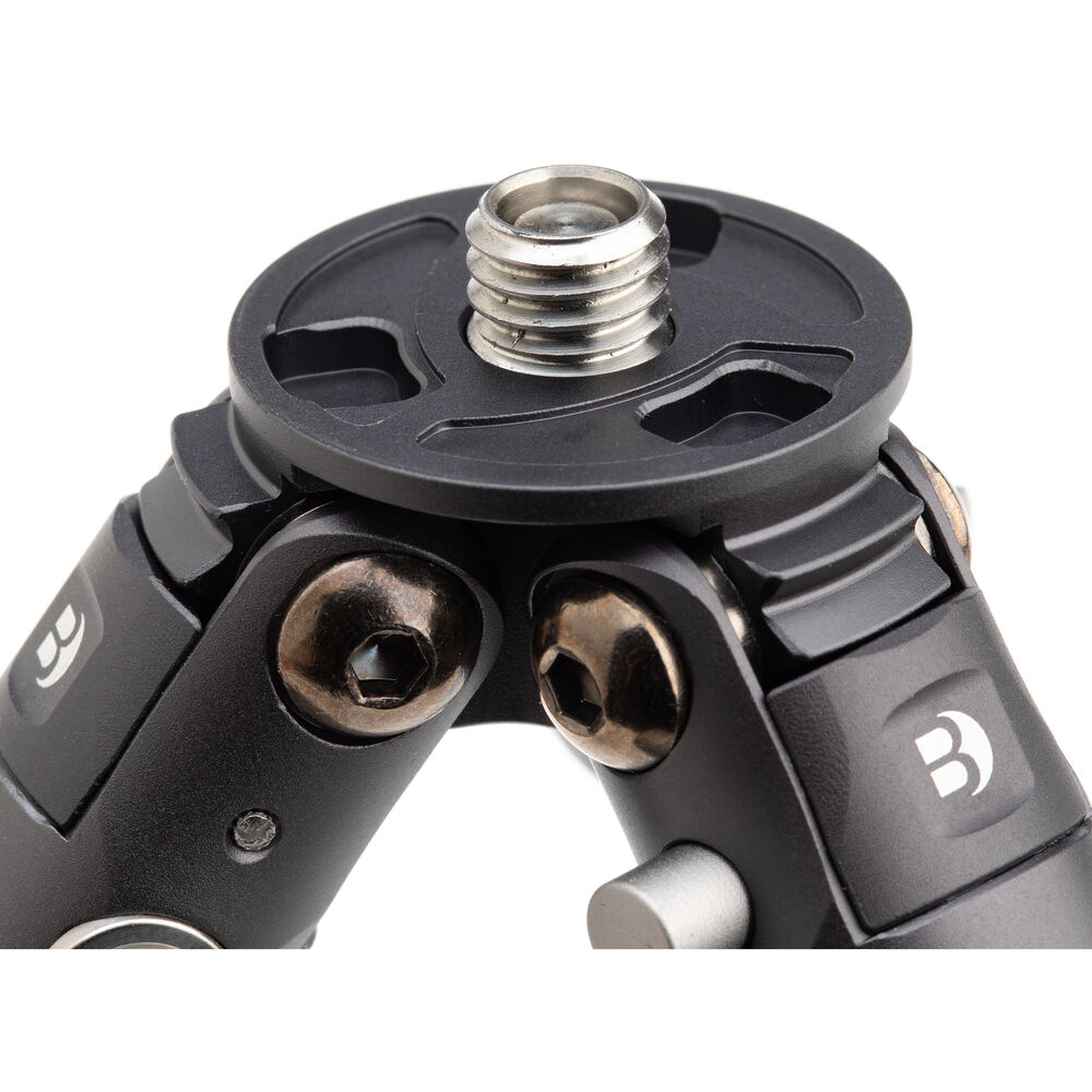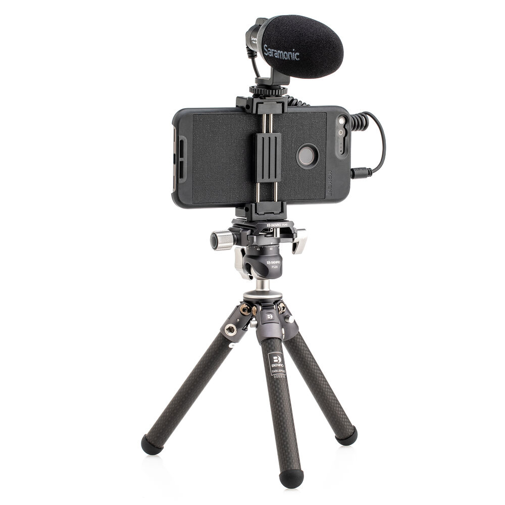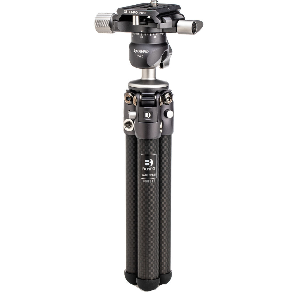 the TablePod Kit Carbon Fiber Tripod and Ball Head with Quick Release Plate and Smartphone Adapter from Benro is a compact and portable tabletop tripod with a load capacity of 6.6 lb and an integrated Arca-type ball head. Three individual adjustable leg settings allow shooting in standard perspective, working in tight spots, or capturing low angles with ease. Simply press the side button on the leg, adjust, and shoot. This travel-size tripod is suitable for photography, self-recording, virtual video meetings, and much more. Two 1/4"-20 mounts allow accessories like microphones, LED lights, and more to be attached.