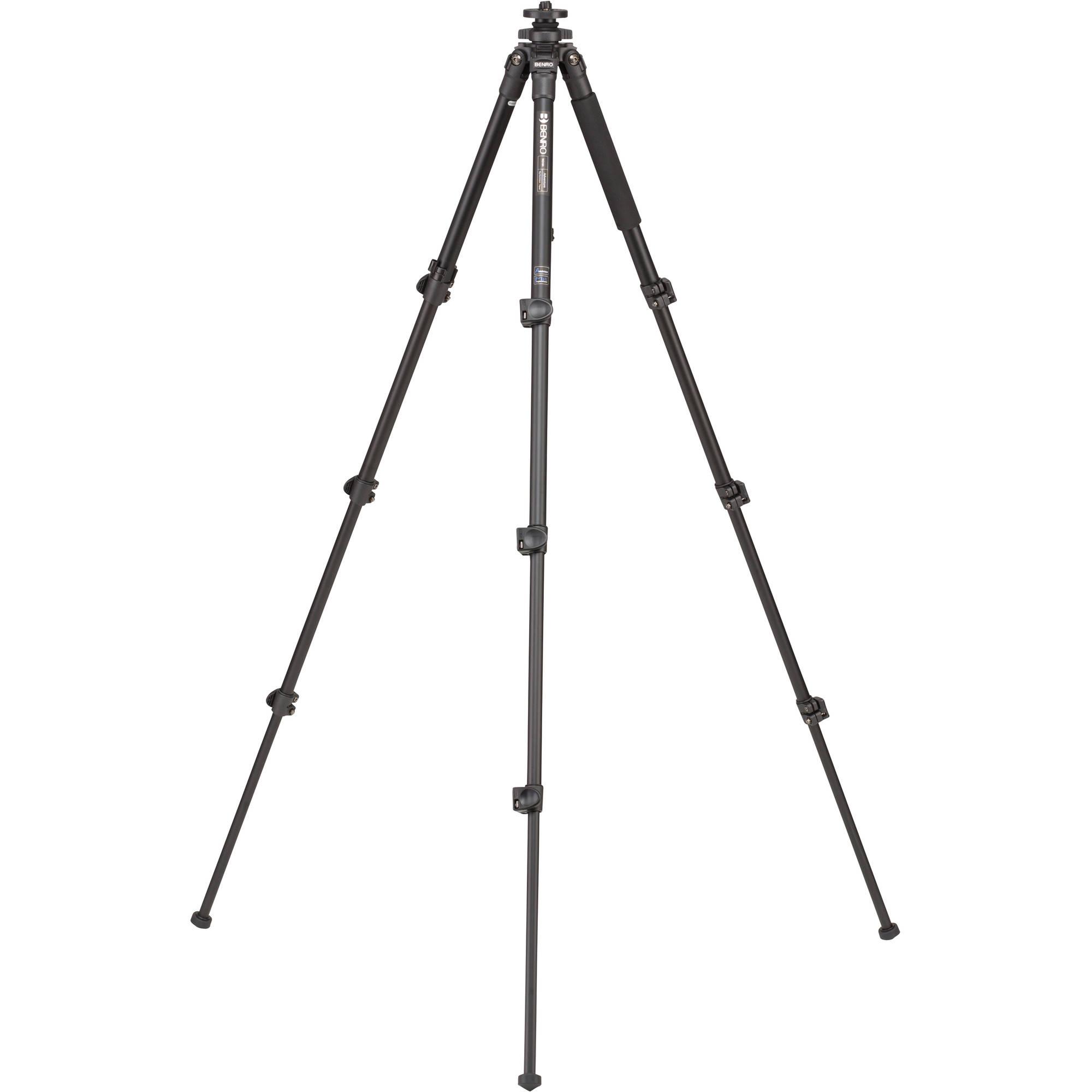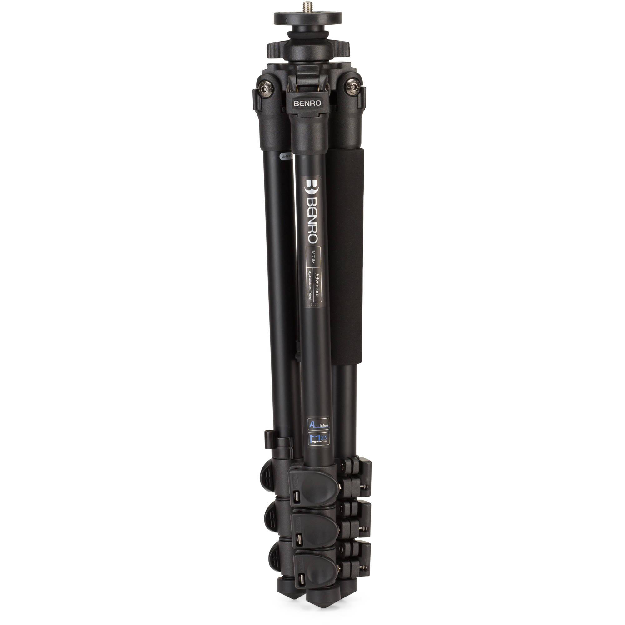The TAD18A Series 1 Adventure Aluminum Tripod from Benro supports up to 17.6 lb, weighs 3.1 lb, extends up to 56.5", and folds down to 19.3". Its 4-section legs use flip lock levers for adjusting the height of each leg. A foam grip on one of the legs enables you to securely hold the tripod and protects your hand during cold weather. A 3/8"-16 thread on top of the tripod allows you to attach any compatible tripod head of your choice. A carrying case with a shoulder strap is included to protect the tripod during transport.