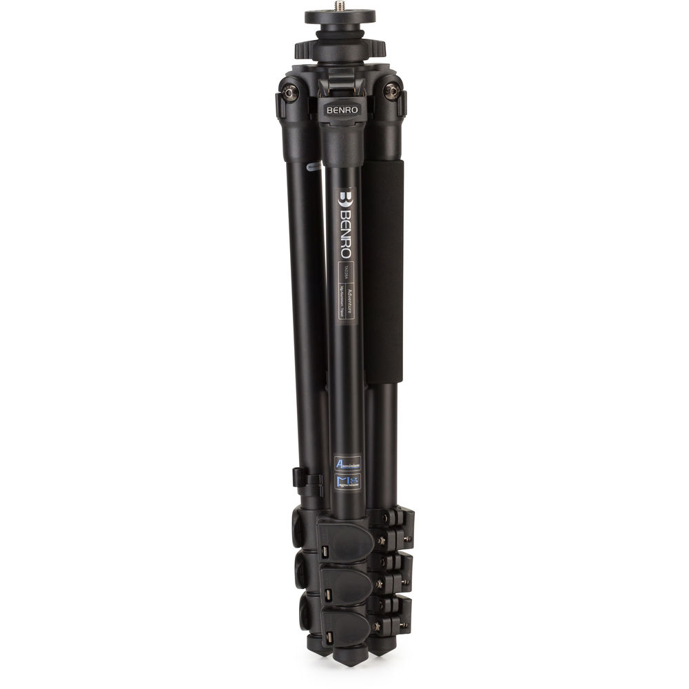 The TAD28A Series 2 Adventure Aluminum Tripod from Benro supports up to 26.5 lb, weighs 4 lb, extends up to 61.4", and folds down to 20.7". Its 4-section legs use flip lock levers for adjusting the height of each leg. A foam grip on one of the legs enables you to securely hold the tripod and protects your hand during cold weather. A 3/8"-16 thread on top of the tripod allows you to attach any compatible tripod head of your choice. A carrying case with a shoulder strap is included to protect the tripod during transport.