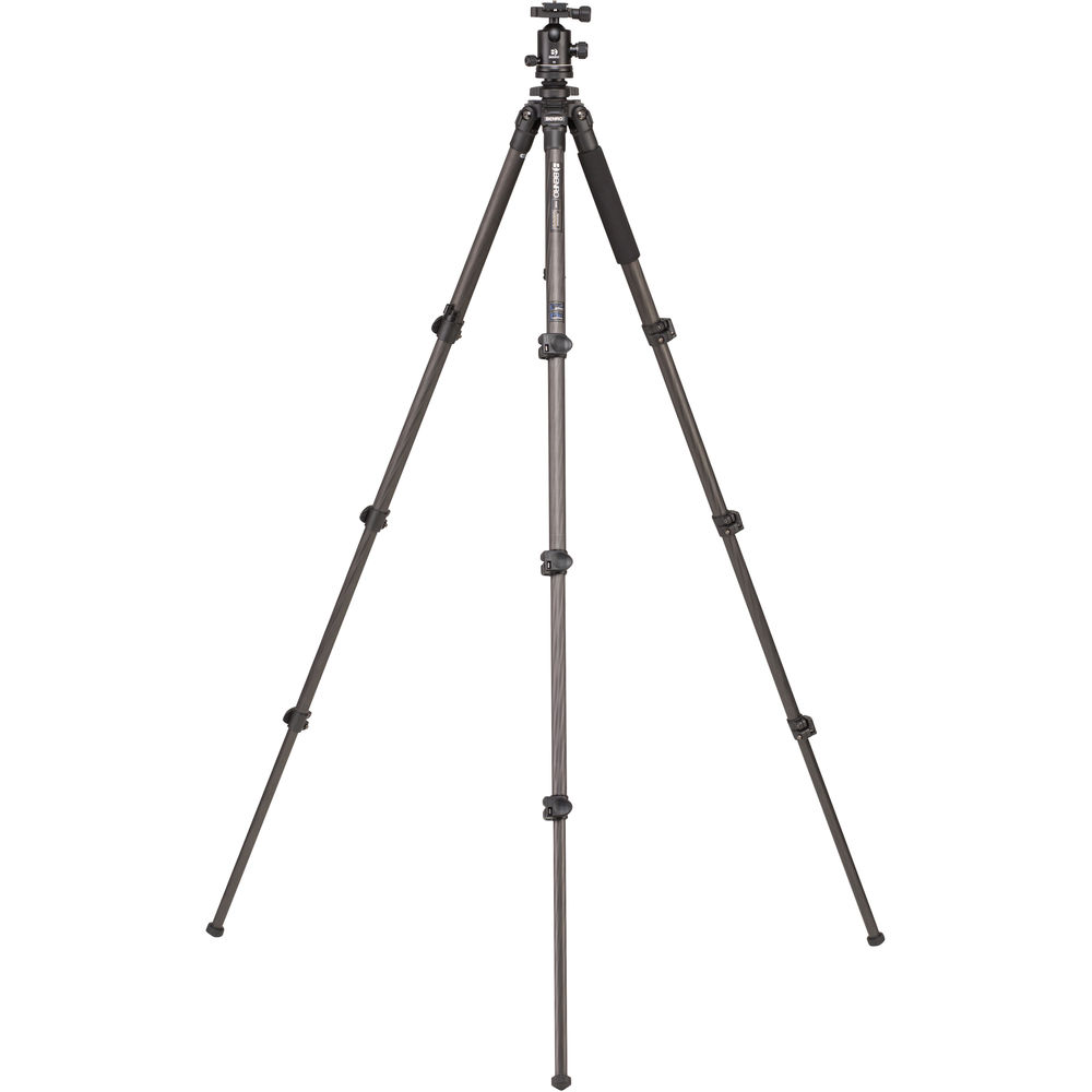 The TAD28C Series 2 Adventure Carbon Fiber Tripod from Benro supports up to 26.5 lb, weighs 3.2 lb, extends up to 61.4", and folds down to 20.7". Its 4-section legs use flip lock levers for adjusting the height of each leg. A foam grip on one of the legs enables you to securely hold the tripod and protects your hand during cold weather. A 3/8"-16 thread on top of the tripod allows you to attach any compatible tripod head of your choice. A carrying case with a shoulder strap is included to protect the tripod during transport.