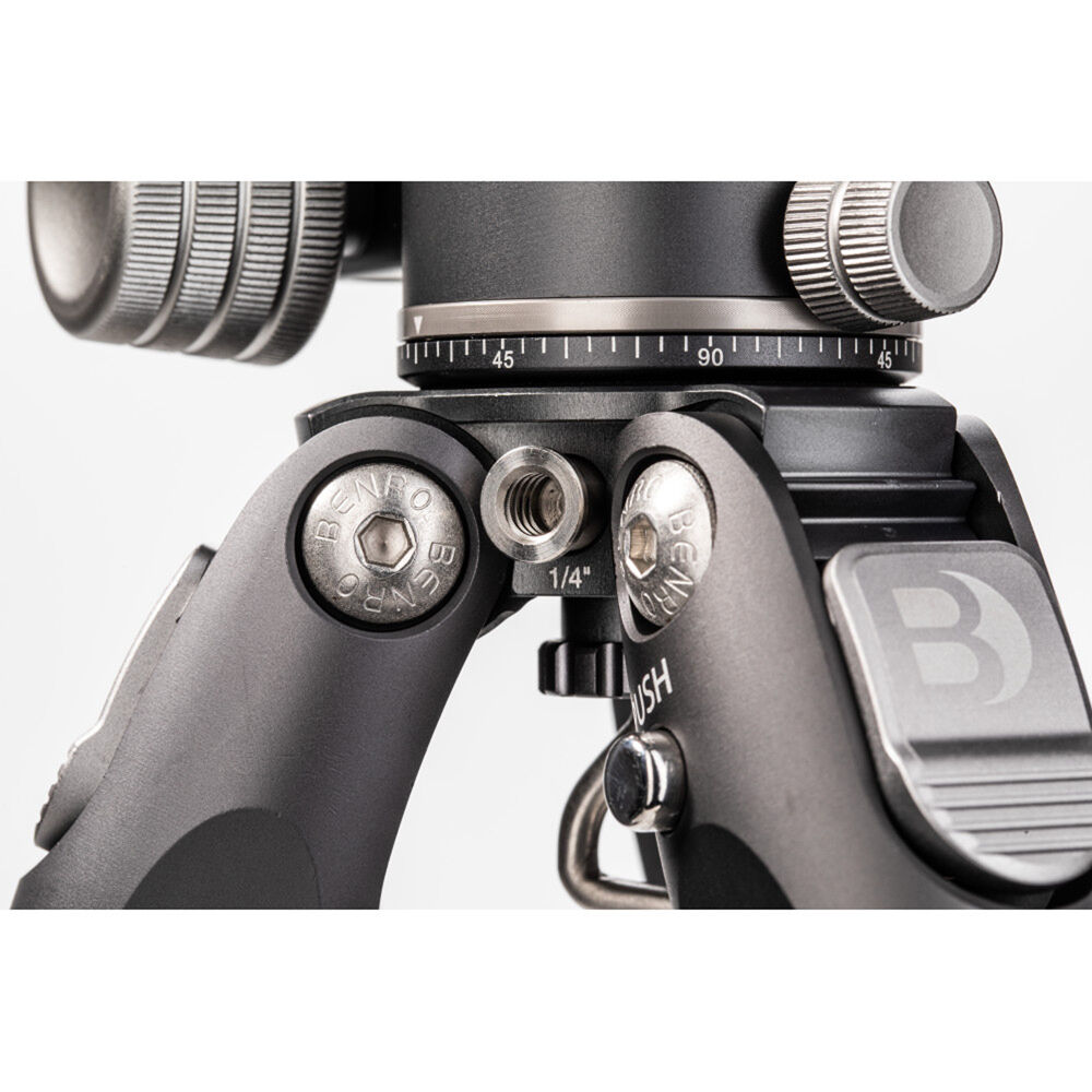 The small yet mighty Tortoise Columnless Carbon Fiber One Series Tripod with GX25 Ball Head from Benro is a compact, lightweight travel tripod with a high load capacity and remarkable stability. The center column-free design makes it nimble and lightweight for travel and reduces the potential for shake common to high center column positioning. This is especially significant when shooting video content. The legs offer independent spread and three locking positions and incorporate automatic leg angle adjustment for fast and sure setup. The aluminum leg spider features a 1/4"-20 accessory mounts for extension arms, monitors, lights, and more. The rubber feet feature three distinct contact surface providing a grip whether the legs are vertical, on an angle, or nearly horizontal when positioned.