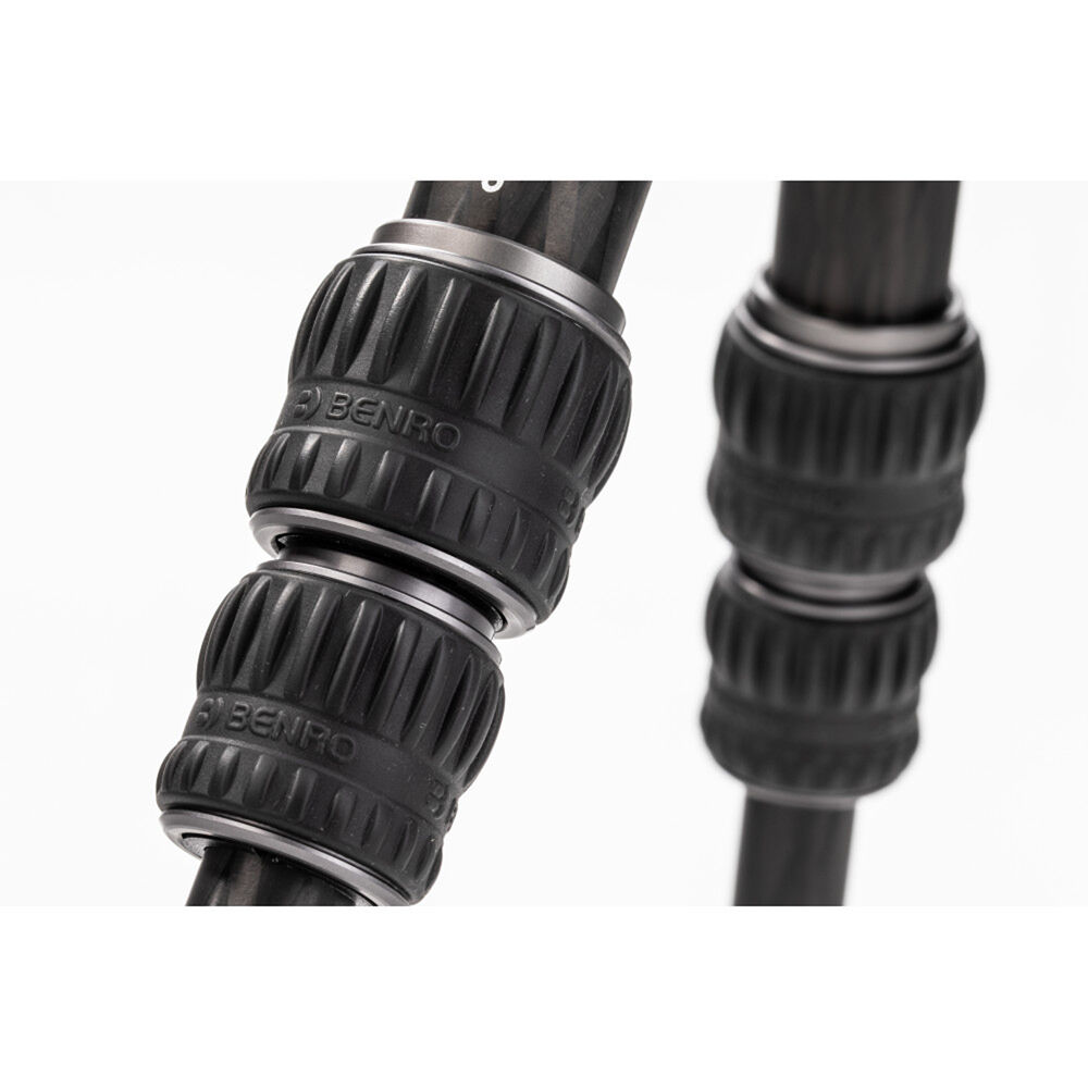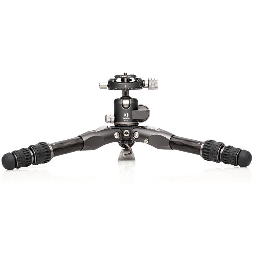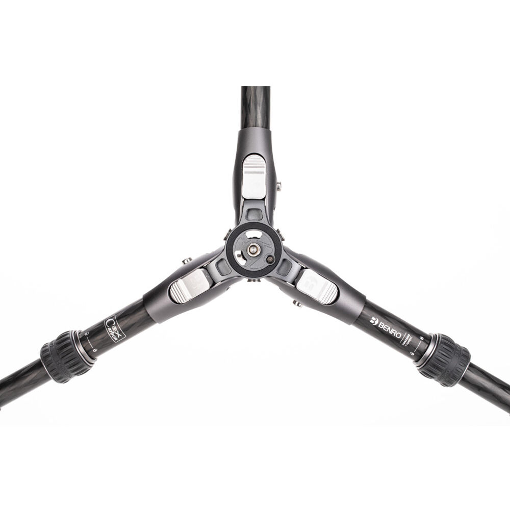 The small yet mighty Tortoise Columnless Carbon Fiber Zero Series Tripod with GX25 Ball Head from Benro is a compact, lightweight travel tripod with a high load capacity and remarkable stability. The center column-free design makes it nimble and lightweight for travel and reduces the potential for shake common to high center column positioning. This is especially significant when shooting video content. The legs offer independent spread and three locking positions and incorporate automatic leg angle adjustment for fast and sure setup. The aluminum leg spider features a 1/4"-20 accessory mounts for extension arms, monitors, lights, and more. The rubber feet feature three distinct contact surface providing a grip whether the legs are vertical, on an angle, or nearly horizontal when positioned.