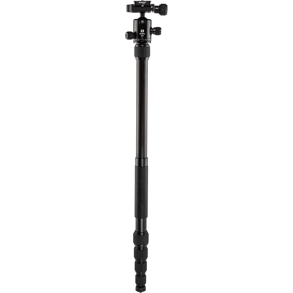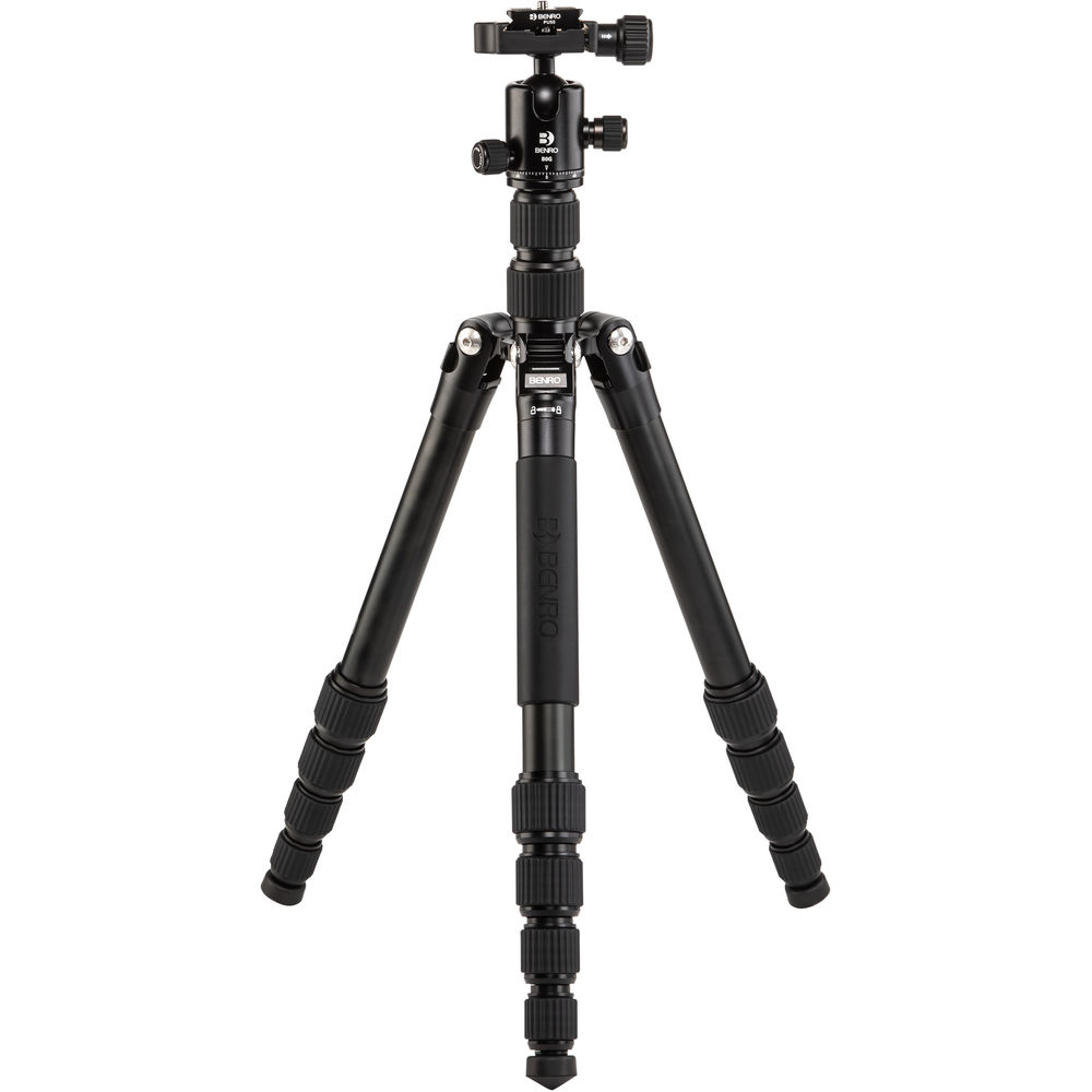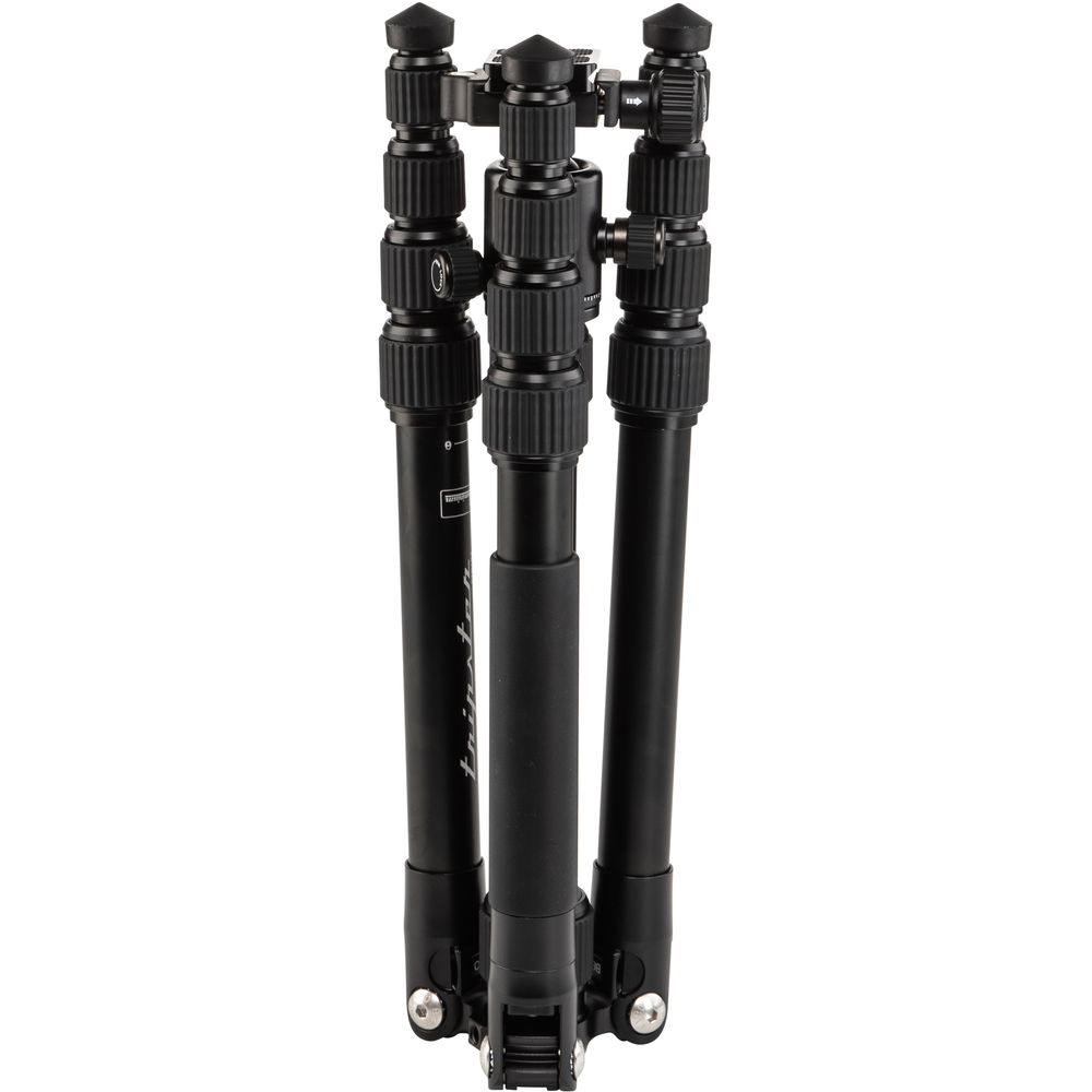The black 1 Series Tripster Travel Tripod from Benro is a five-section aluminum tripod with a two-section center column that combine to reach a maximum height of 59.3", while weighing 3.4 lb. Splaying the legs completely out, the support drops to a minimum height of 14". Moreover, the legs fold in the reverse to a compact 14.2", so you can carry it to the next location. The removable center column and one leg can combine to create a monopod with a maximum height of 61.4". The Arca-type compatible ball head has a load capacity of 18 lb and includes a quick release plate with a 1/4"-20 camera mounting thread. Additionally, a 1/4"-20 socket located on the yoke of the tripod is used to attach other accessories that would aid you in creating a photograph.