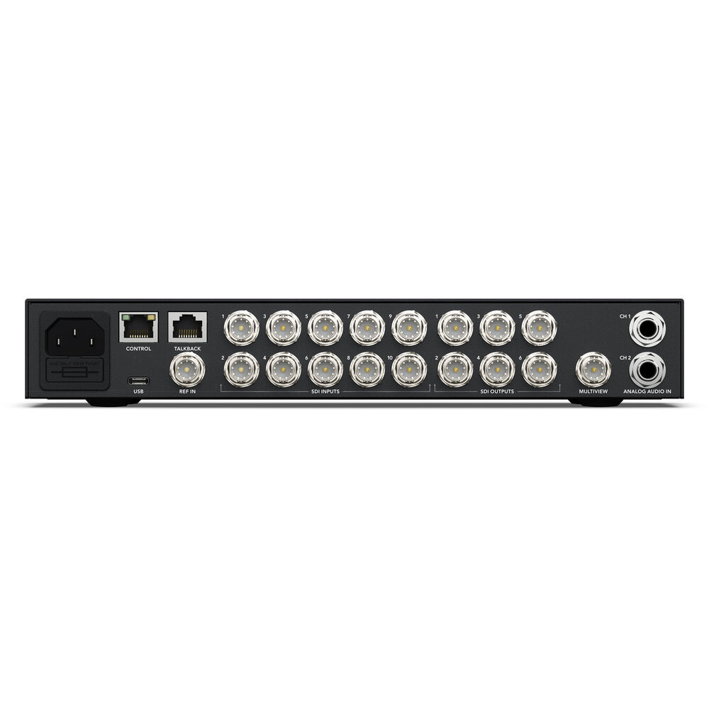 The switcher features a reference video input, and each input features a frame synchronizer, frame rate converter, and format converter. This allows you to mix and match cameras, formats, cameras that do not feature genlock, and video input from computer sources. Upstream and downstream keyers and effects are supported. All this is done live and in real time with no rendering required. You can control the switcher using the integrated front panel, optional Blackmagic ATEM panels, or via the downloadable control software.