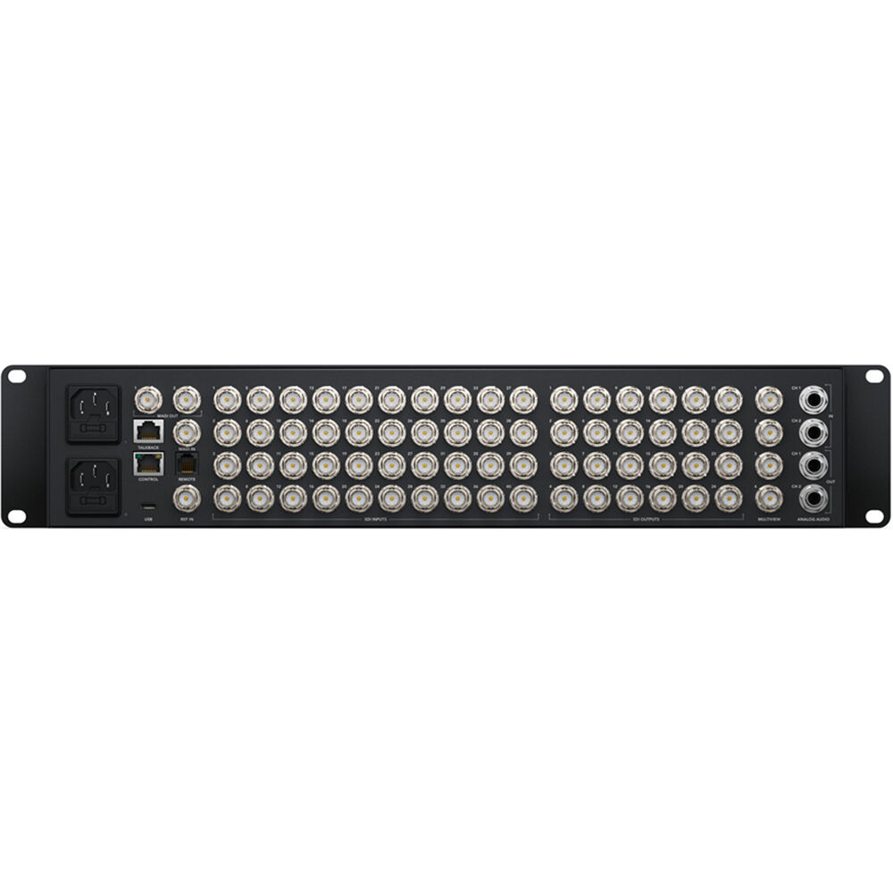 The switcher also boasts a reference video input, and each input features a frame synchronizer, frame rate converter, and format converter, allowing you to mix and match cameras that do not have genlock capabilities. Upstream and downstream keyers and effects are supported in real time. The switcher can be controlled using the integrated front panel, optional Blackmagic ATEM panels, or via the downloadable control software.