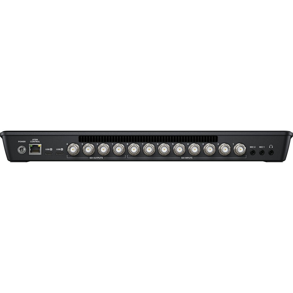 The front panel includes easy-to-use buttons for selecting sources, video effects, and transitions. The source buttons are large, allowing you to operate them by feel. Included on the ATEM Extreme ISO are buttons for audio mixing, recording, and streaming control, as well as output selection buttons that let you change the video output between cameras, program, and multiview. On the rear panel, there are 3G-SDIconnections for cameras or computers, extra microphone inputs, USB for webcam out, plus 4 x 3G-SDI "AUX" outputs for program video.
