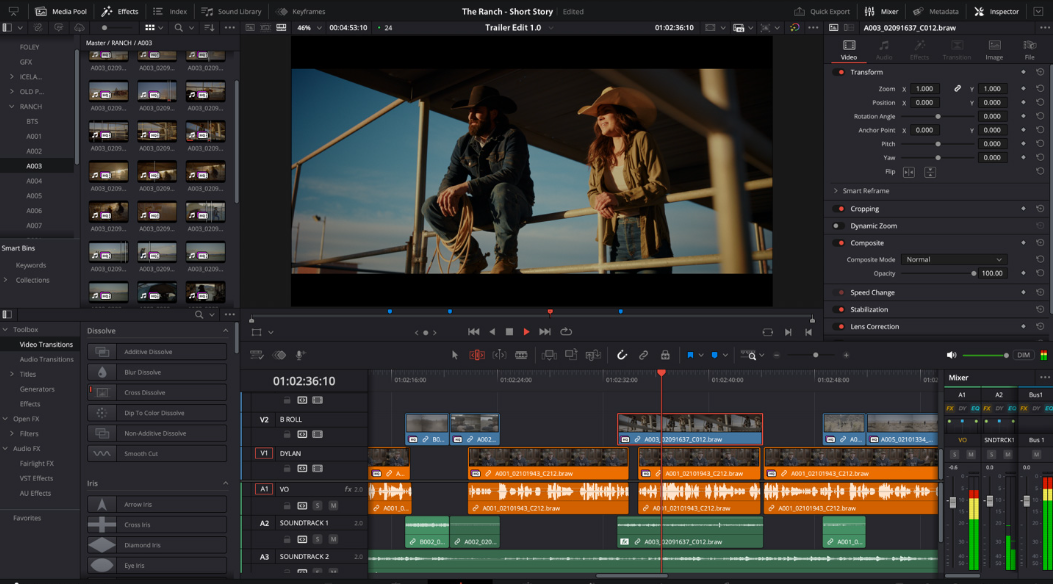 The edit page is the world’s most advanced professional non-linear editor. The familiar track layout, dual monitor design and traditional workflow makes it easy for new users to learn while still being powerful enough for professional editors. It’s perfect for larger projects such as feature films, television shows, streaming, commercials, documentaries and more. The edit page features drag and drop editing, context sensitive automatic trimming tools, fully customizable keyboard shortcuts so you can work faster, and a library full of hundreds of titles, transitions, and effects that you can add and animate. You also get complete media management, organization and timeline management tools.