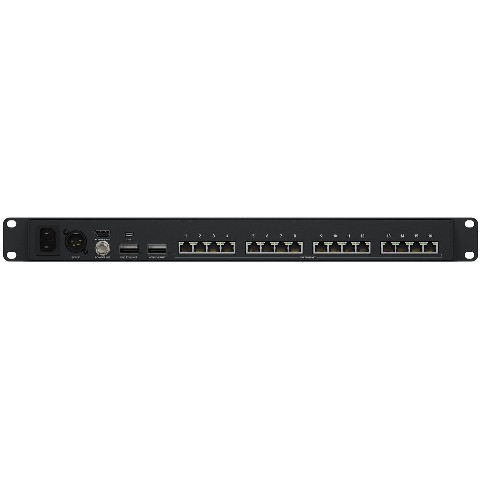 Designed for the film and television industry, the Ethernet Switch 360P from Blackmagic Design provides extremely high performance plus low latency. This Switch incorporates 16 fast 10G Ethernet ports and two extremely high-speed 100G Ethernet QSFP sockets for copper cables or optical fiber modules. The front has a built-in panel that you can use to set up 2110 IP multicasting using familiar video routing, so you don't need a team of IT technicians. This switch looks like a router at the front with a control panel, buttons, display, and wheel and like an Ethernet switch at the back. It supports SMPTE 2110 video and provides sixteen 10GbE and two 100GbE RJ45 ports that are located on the back for easier cable management. Suitable for complex configurations, the Internet Switch 360P is ideal for fly-pack and small broadcast truck use. A speed graph is visible on the monitor output for each port and dynamic labels for connected 2110 devices are displayed in alphabetical order on the front screen for quick identification.