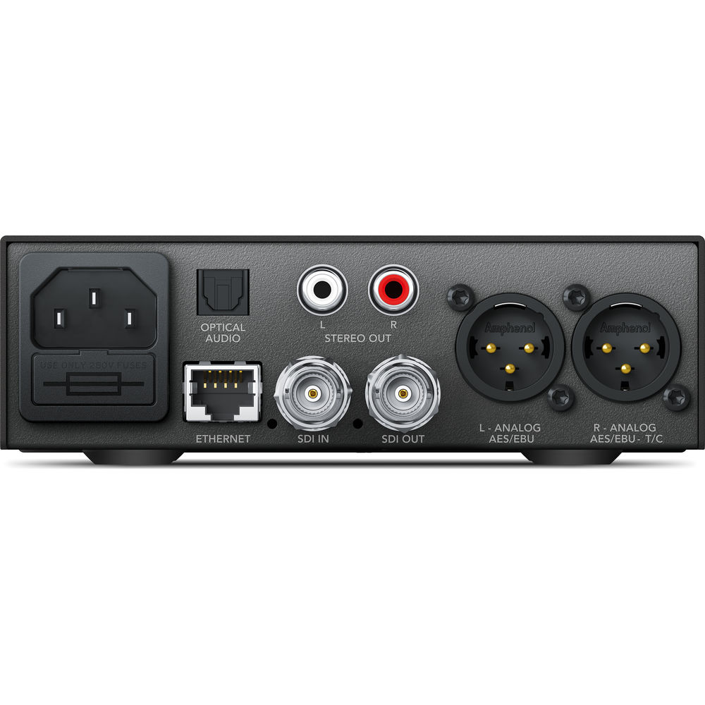 Supporting up to 12G-SDI data rates with intelligent heat dissipation, and offering multiple audio output connections and an Ethernet control and PoE port, the Teranex Mini SDI to Audio 12G Converter, from Blackmagic Design, is a highly improved solution for rack-mount as well as cable duct and desktop installations. Connect any SDI signal in up to Full 4K DCI 4096x2160p resolution via a 12G-SDI input, and de-embed audio from the signal and output it via a diverse set of audio connections. Output two channels of analog audio or up to four channels of AES/EBU digital audio via full-size, professional balanced XLR ports, two channels of unbalanced analog line-level audio via RCA connectors, or optical S/PDIF audio via a TOSLINK output. Connect the audio signal to a wide range of audio equipment, such as mixers, decks, and audio monitors. There's also a 12G-SDI output for routing the original signal. Route 4096x2160p signals approximately 70 ft using 6G-SDI cables, and run lower-resolution signals, such as 3G-SDI or HD-SDI, for much longer than standard lengths. When 12G-SDI cables will be available on the market, you'll be able to run 4096x2160p signals for over 250 ft.