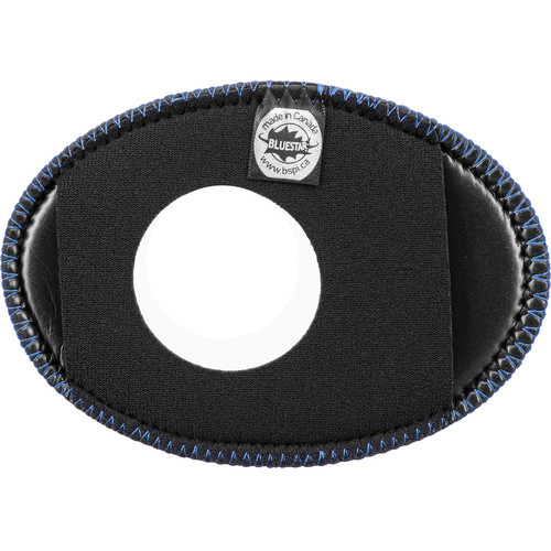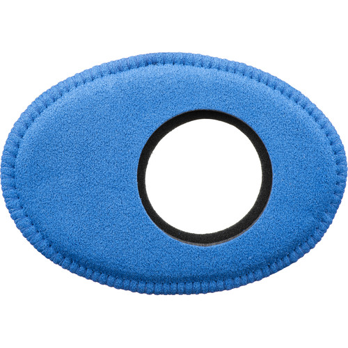 The Oval Extra-Large Viewfinder Eyecushion in blue Ultrasuede, from Bluestar, features outside dimensions of 5.1 x 3.6" to securely fit over many common external and built-in viewfinders. These include the Alphatron, the Kamerar QV-1, VF-4, and VF-4+ EVFs, the MagView 3:2, 4:3, and 16:9 EVFs, those of the Canon C100, C200, C300, C500, XF300, XF305, and XF205 HD cameras, the EVFs of the Sony FS5, HVR-S270, HXR-NX100, and PXW-Z150 cameras, and many more. This Ultrasuede version is made of 100% non-woven material consisting of intertwined, brushed, ultra-fine fiber strands. It provides a high level of softness and a superior moisture absorption rate, and it can be used in any climate.