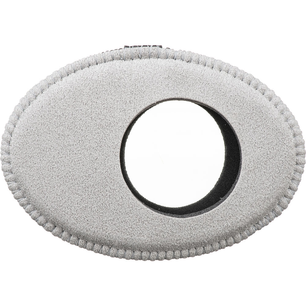 The Oval Extra-Large Viewfinder Eyecushion in gray Ultrasuede, from Bluestar, features outside dimensions of 5.1 x 3.6" to securely fit over many common external and built-in viewfinders. These include the Alphatron, the Kamerar QV-1, VF-4, and VF-4+ EVFs, the MagView 3:2, 4:3, and 16:9 EVFs, those of the Canon C100, C200, C300, C500, XF300, XF305, and XF205 HD cameras, the EVFs of the Sony FS5, HVR-S270, HXR-NX100, and PXW-Z150 cameras, and many more. This Ultrasuede version is made of 100% non-woven material consisting of intertwined, brushed, ultra-fine fiber strands. It provides a high level of softness and a superior moisture absorption rate, and it can be used in any climate.