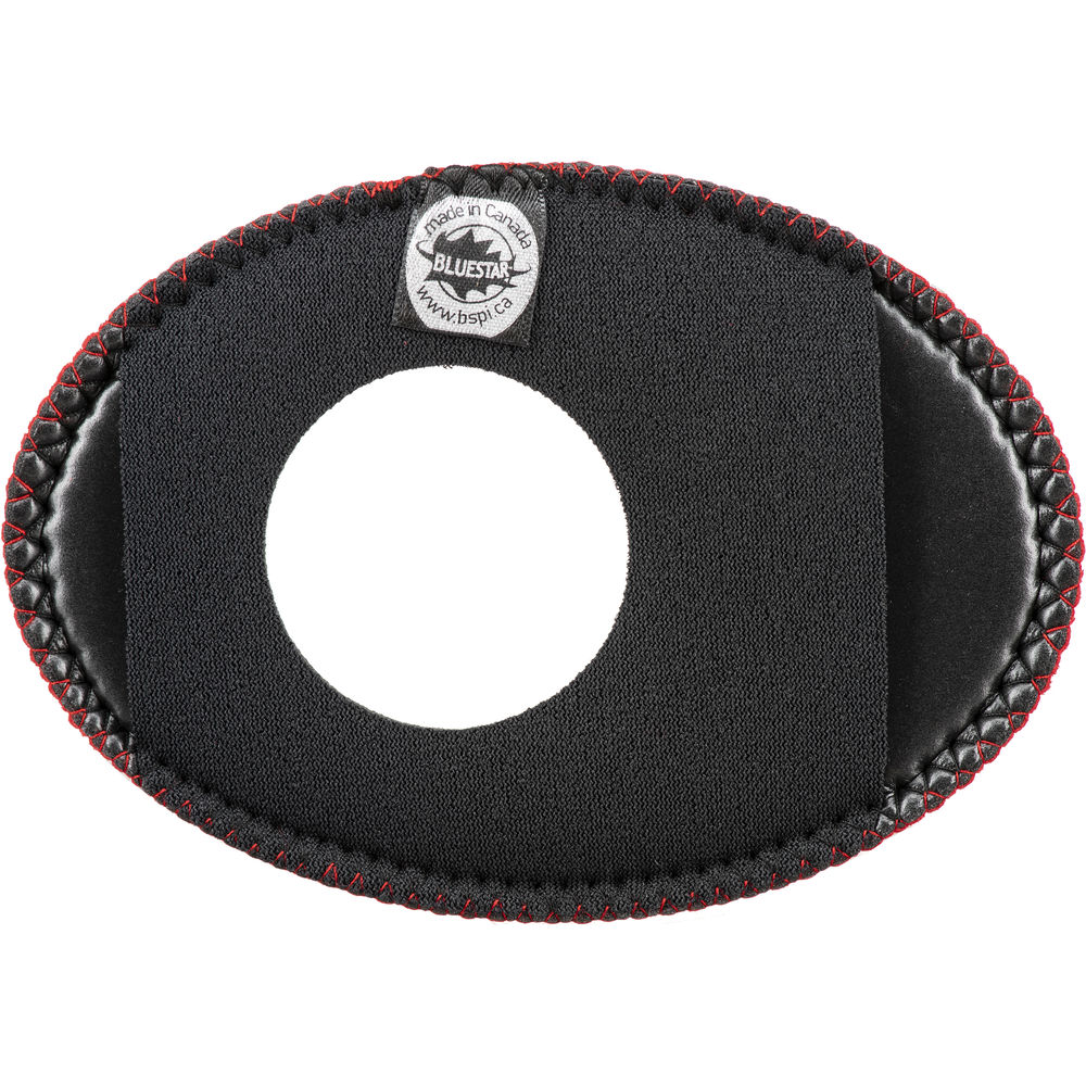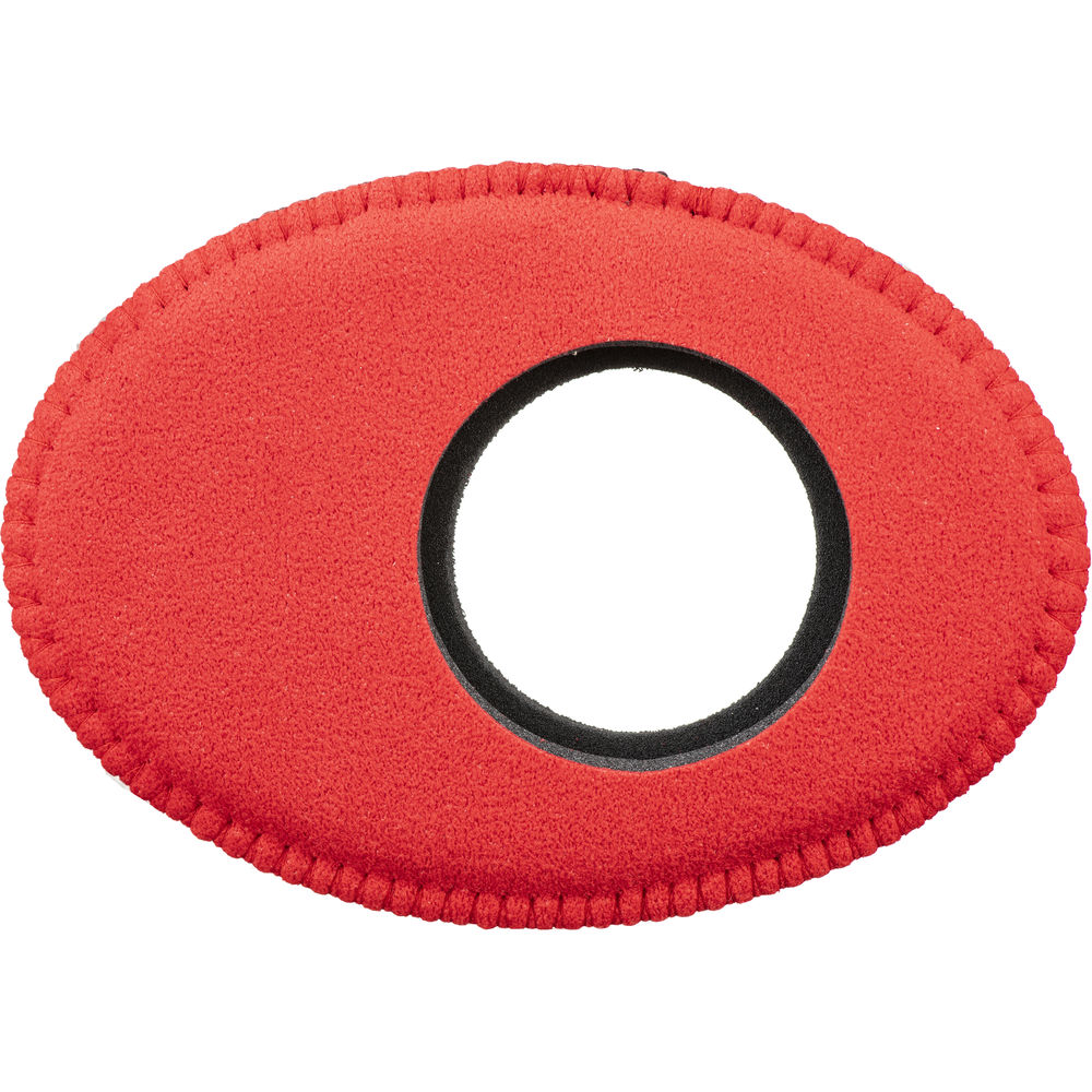 The Oval Extra-Large Viewfinder Eyecushion in red Ultrasuede, from Bluestar, features outside dimensions of 5.1 x 3.6" to securely fit over many common external and built-in viewfinders. These include the Alphatron, the Kamerar QV-1, VF-4, and VF-4+ EVFs, the MagView 3:2, 4:3, and 16:9 EVFs, those of the Canon C100, C200, C300, C500, XF300, XF305, and XF205 HD cameras, the EVFs of the Sony FS5, HVR-S270, HXR-NX100, and PXW-Z150 cameras, and many more. This Ultrasuede version is made of 100% non-woven material consisting of intertwined, brushed, ultra-fine fiber strands. It provides a high level of softness and a superior moisture absorption rate, and it can be used in any climate.
