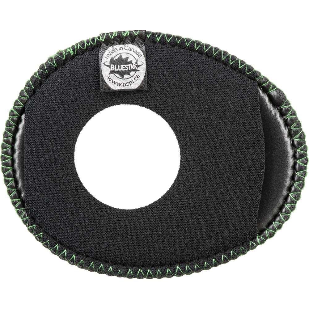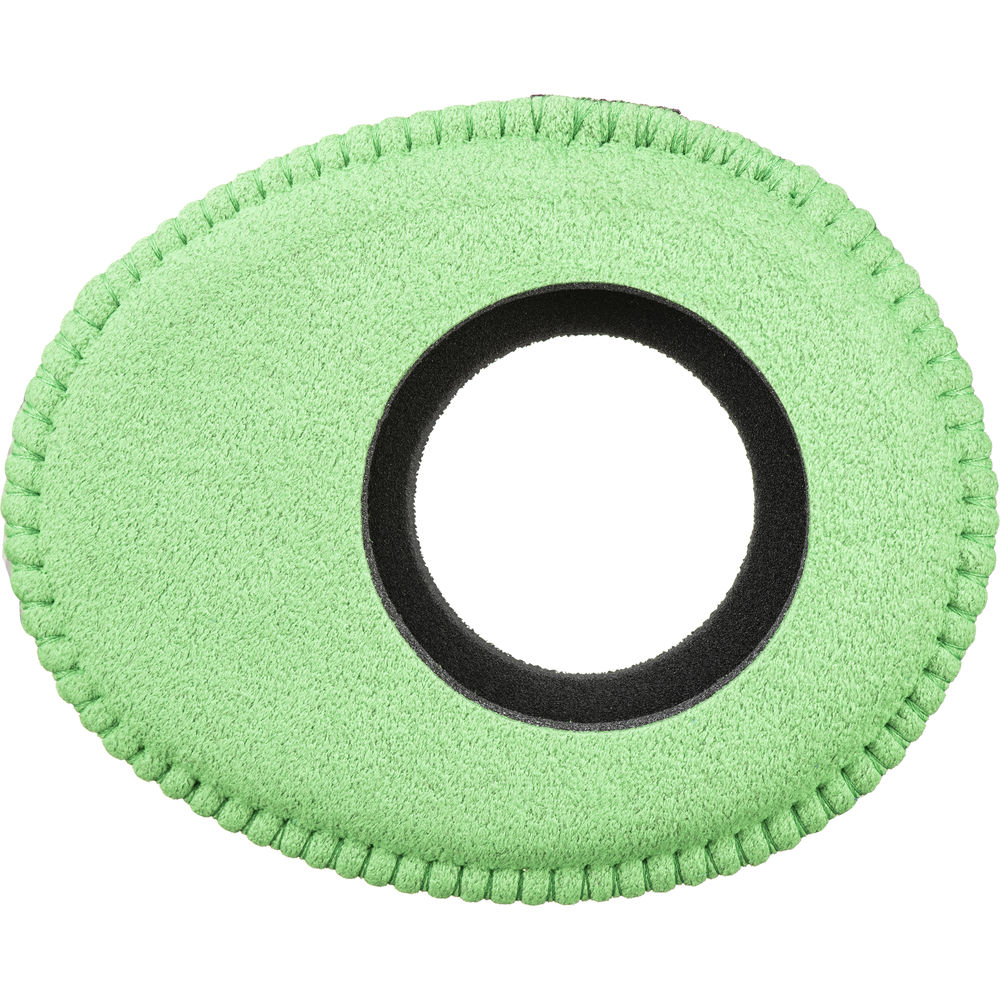 The Oval Large Viewfinder Eyecushion in green Ultrasuede, from Bluestar, features outside dimensions of 4 x 3.2" to securely fit over many common external and built-in viewfinders. These include the viewfinders of the Sony VENICE, PDW-F800, FS-100, FS-700, F55, F5, EX3, and EX1, the Canon C700, JVC GY-100U, Panasonic VariCam 27F, VariCam 4K, DVCPRO HD, and DVX200 4K, and many more. This Ultrasuede version is made of 100% non-woven material consisting of intertwined, brushed, ultra-fine fiber strands. It provides a high level of softness and a superior moisture absorption rate, and it can be used in any climate.