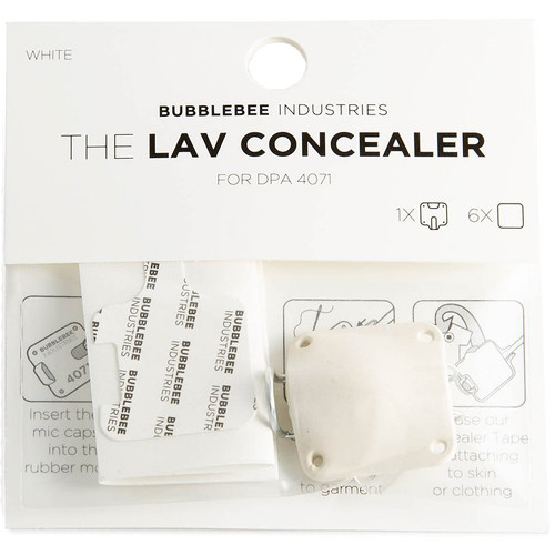 The white Bubblebee Industries Lav Concealer for DPA 4071 Mic is a soft, pliable mount that can be clipped to clothing, taped to skin, or sewn into costumes, molding itself to the surface on which it is attached. The mount fits the capsule perfectly, making it easy to hide the mic while protecting it from build-up of glue residue resulting from repeatedly attaching tape directly on the lav.