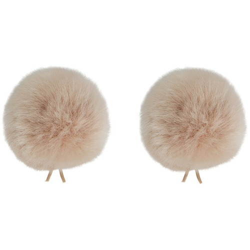 This Twin Windbubbles from Bubblebee Industries is a set of two beige miniature imitation-fur windscreens that easily fit on lavalier microphones with a diameter of 0.19 to 0.35" (5 to 9mm). The tiny elastic-wire legs make it easy to mount them on the microphones. They can be used to reduce wind noise and vocal plosives in outdoor environments, and are designed to not fall off during use.