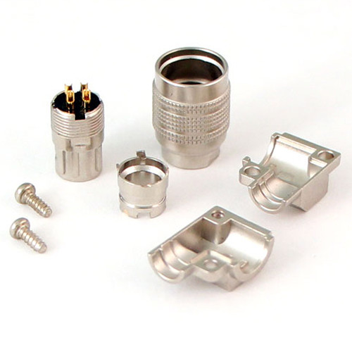 The nickel Cable Techniques 4-Pin Male DC Push-Pull Connector (Right-Angle End) is a connector designed to be attached to a DC power cable for use with portable mixers and DC distribution units in ENG, field recording, and television production. It features a Hirose-compatible, 4-pin male end with gold contacts and a nickel shell. The push-pull connection style allows quick cable releases while preventing accidental disconnection. The right-angle connector offers four cable-exit positions for optimal cable placement.