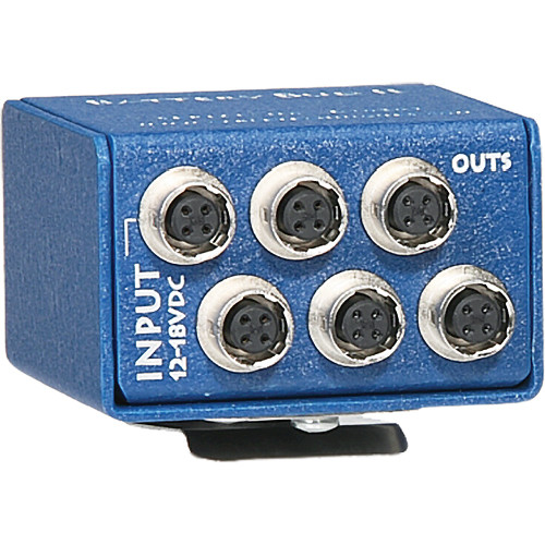 The Battery Bud II from Cable Techniques is a lightweight and portable DC power distribution box that allows you to power multiple devices from a single battery or power source. The Battery Bud II accepts 12-18VDC power and uses standard 4-pin Hirose connectors. It offers a single power input and 5 outputs, all of which are on the bottom of the unit for seamless bag integration. An internal 6A electronic auto-resetting breaker prevents damage due to overload. A recessed power switch makes it easy to have a "master" switch for your whole bag of gear. The Battery Bud II has a lightweight metal construction with a removable belt clip and a durable powder coat finish.