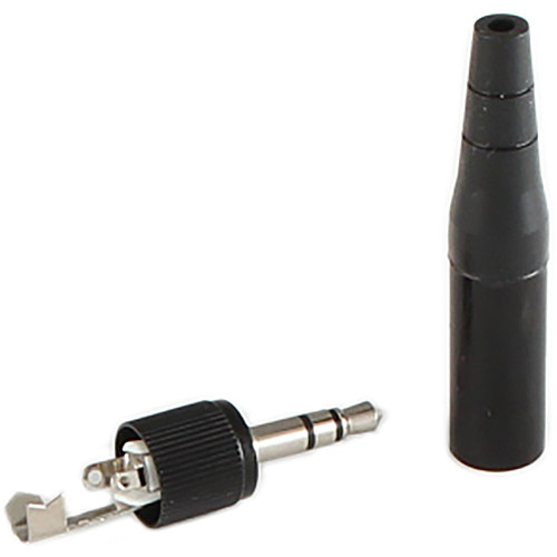 The black Cable Techniques Deluxe 3.5mm TRS Locking Connector is a single connector designed to be wired on interconnect cables or lavalier microphones. It features a 3.5mm TRS male plug with a screw-locking collar, making it compatible with popular wireless equipment such as the Sennheiser G4/G3 and 2000 Series, the Rode RODELink, and transmitters from Sony and Azden. This connector utilizes nickel contacts, a black shell, and a three-size rubber outlet boot.