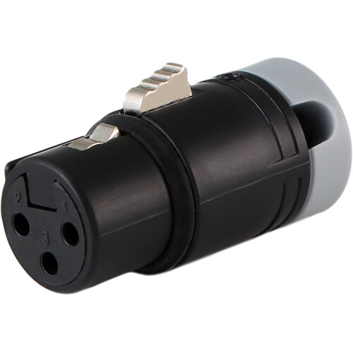 With its space-saving design, the Cable Techniques Low-Profile Right-Angle XLR 3-Pin Female Connector (Large Outlet, A-Shell, Gray Cap) is ideal for use on portable recorders and field mixers in audio bags. Its large cap has a cable outlet that accommodates cabling with diameters from 3.8 to 6mm while offering 120 degrees of adjustment swing around the 3 o'clock and 9 o'clock positions, allowing perfect placement in an array of configurations. This variant features gold pins, a black shell, and a gray cap.