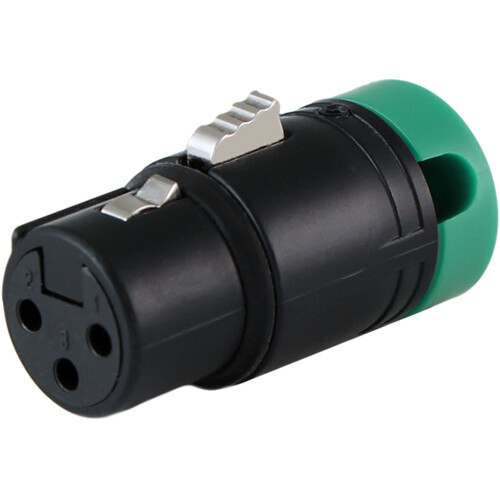 With its space-saving design, the Cable Techniques Low-Profile Right-Angle XLR 3-Pin Female Connector (Large Outlet, A-Shell, Green Cap) is ideal for use on portable recorders and field mixers in audio bags. Its large cap has a cable outlet that accommodates cabling with diameters from 3.8 to 6mm while offering 120 degrees of adjustment swing around the 3 o'clock and 9 o'clock positions, allowing perfect placement in an array of configurations. This variant features gold pins, a black shell, and a green cap.