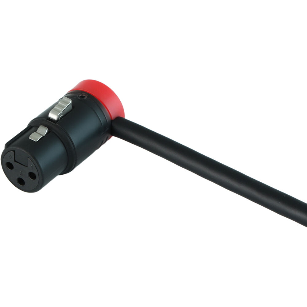 With its space-saving design, the Cable Techniques Low-Profile Right-Angle XLR 3-Pin Female Connector (Large Outlet, A-Shell, Red Cap) is ideal for use on portable recorders and field mixers in audio bags. Its large cap has a cable outlet that accommodates cabling with diameters from 3.8 to 6mm while offering 120 degrees of adjustment swing around the 3 o'clock and 9 o'clock positions, allowing perfect placement in an array of configurations. This variant features gold pins, a black shell, and a red cap.