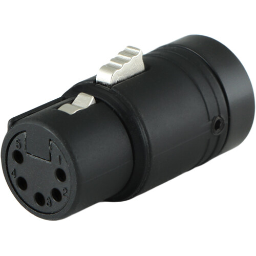 This Low-Profile Right Angle XLR 5-Pin Female from Cable Techniques features a B-Shell, which provides an adjustable multi-angle cable exit 120° around 6 or 12 o'clock. It has a matte black shell with gold pins. Available with black cap. Can be color-coded with the addition of a color cap [sold separately]: red, blue, green, yellow, orange, white, gray, purple and brown.